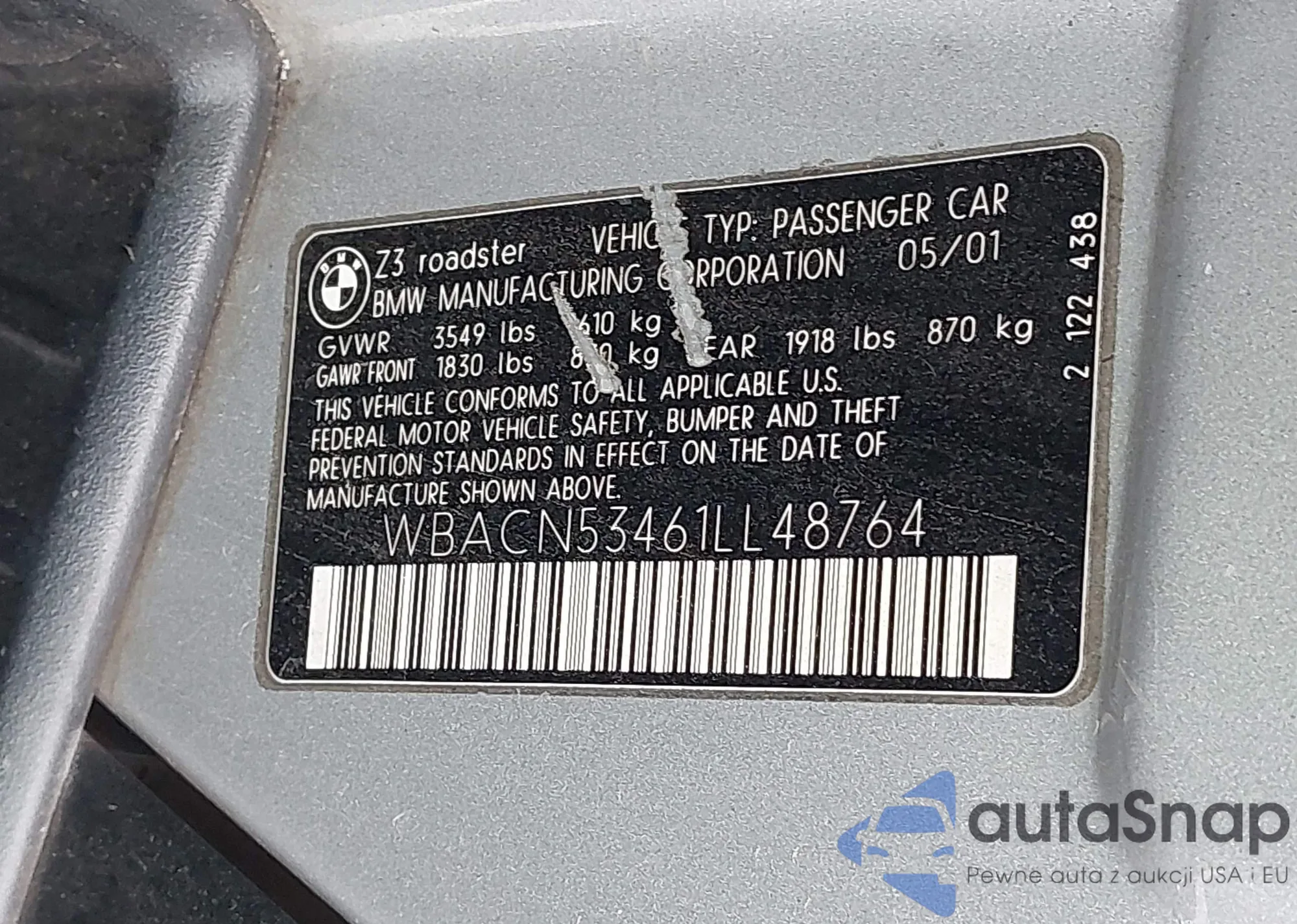 Автомобиль BMW Z3 2001 (VIN WBACN53461LL48764) имеет документы, препятствующие регистрации. Могут возникнуть сложности при экспорте и регистрации. Обратитесь к экспертам AutaSnap для поиска альтернатив.