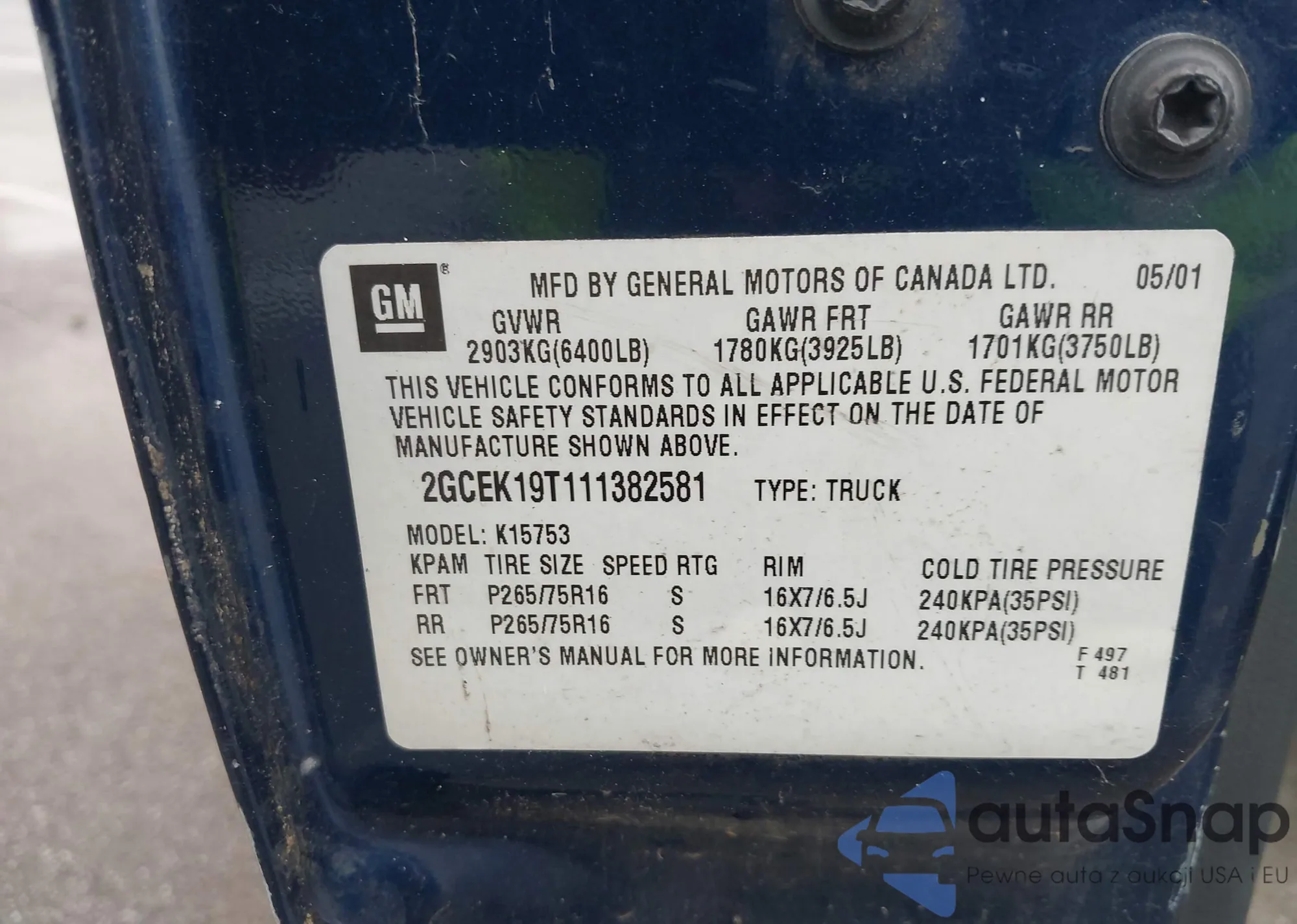 VIN: 2GCEK19T111382581