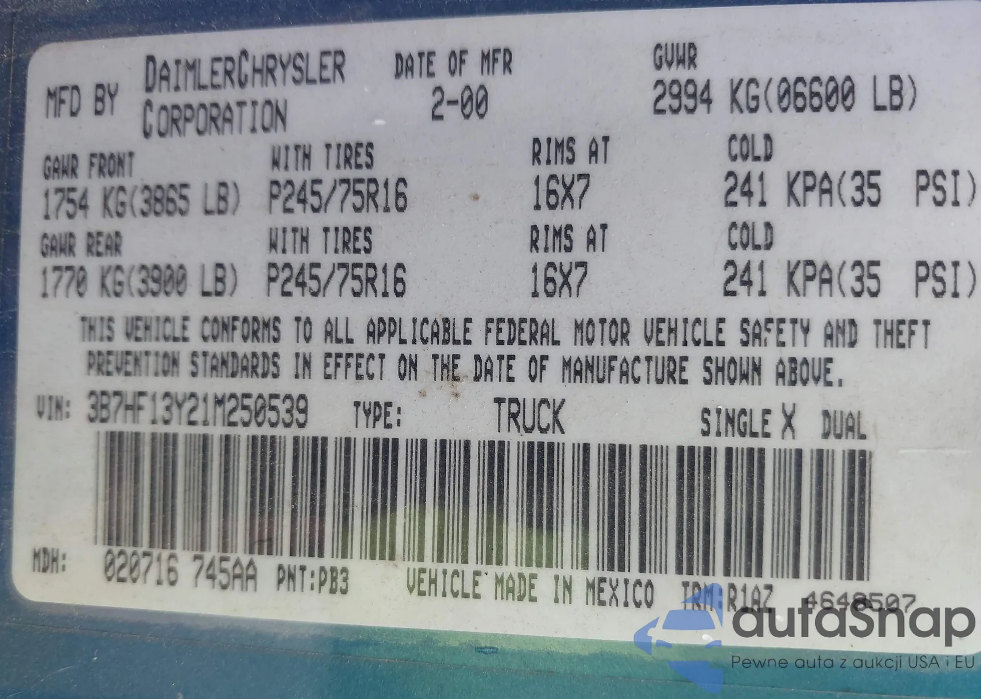 VIN: 3B7HF13Y21M250539