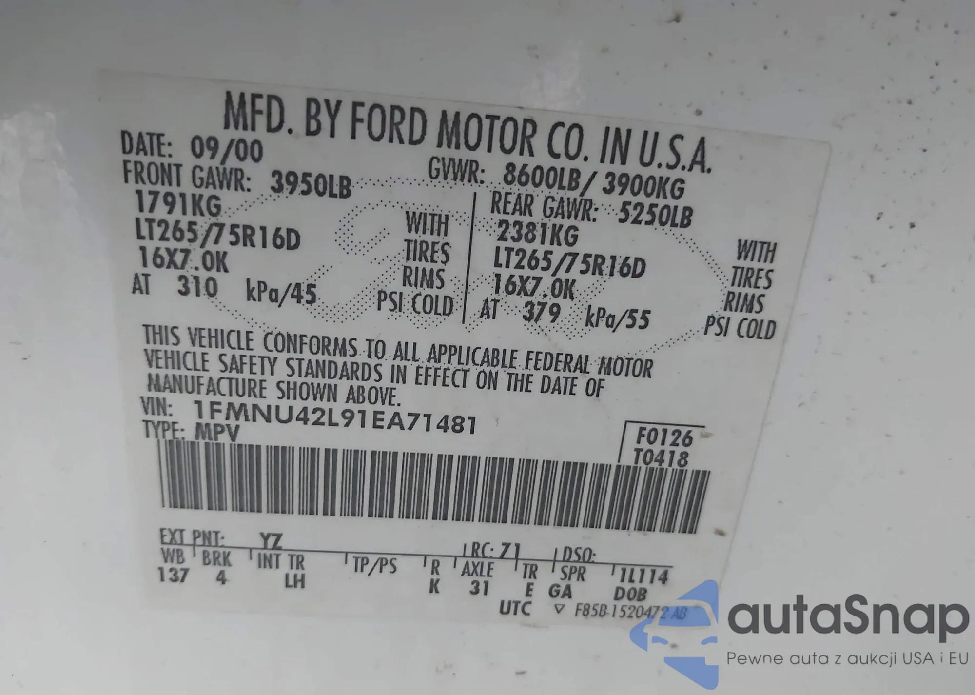 VIN: 1FMNU42L91EA71481