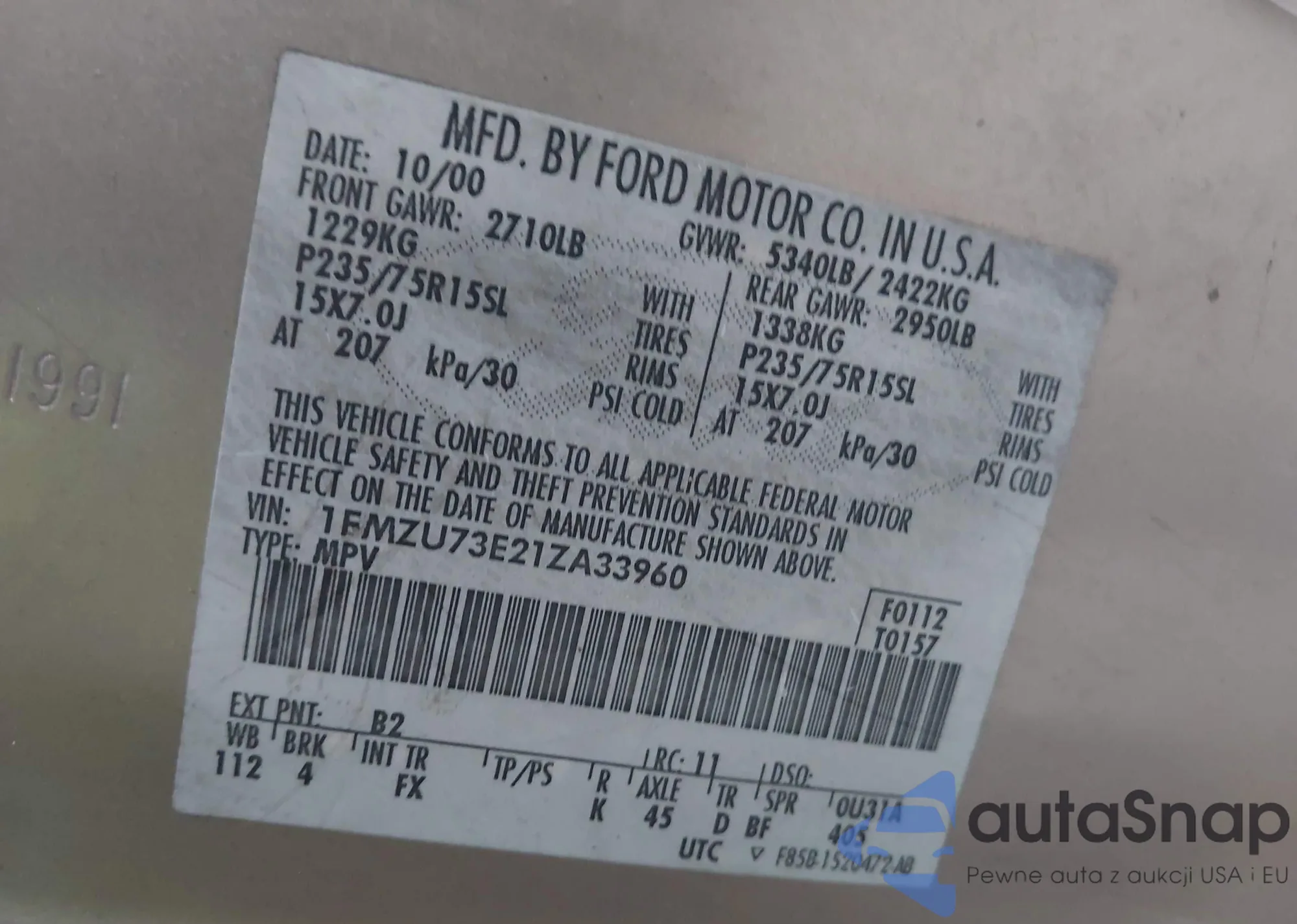 VIN: 1FMZU73E21ZA33960