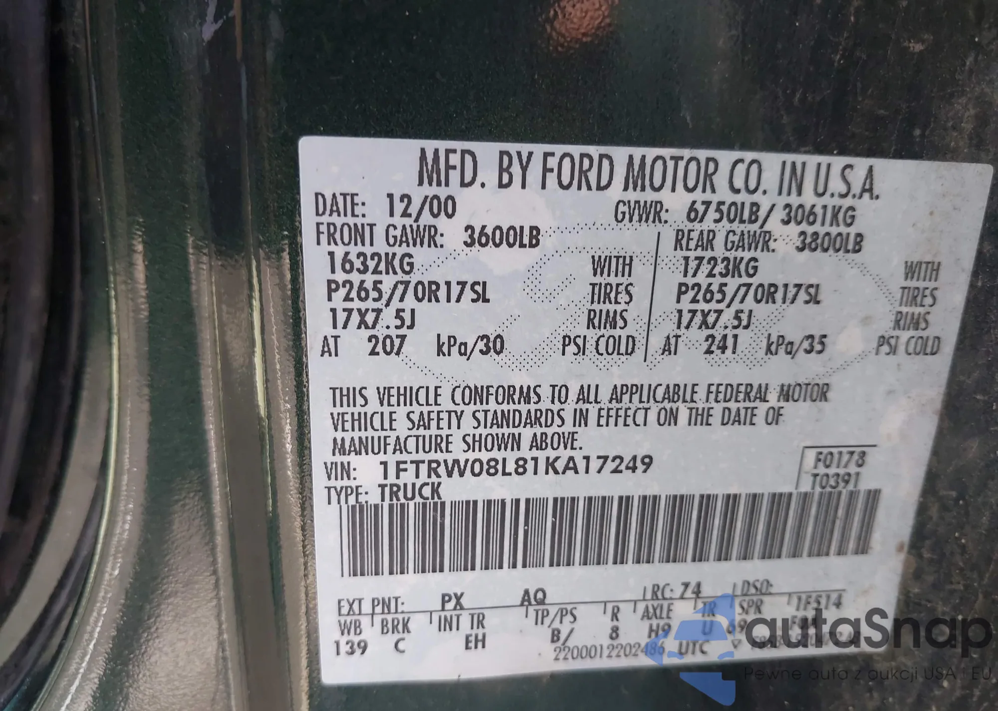 VIN: 1FTRW08L81KA17249