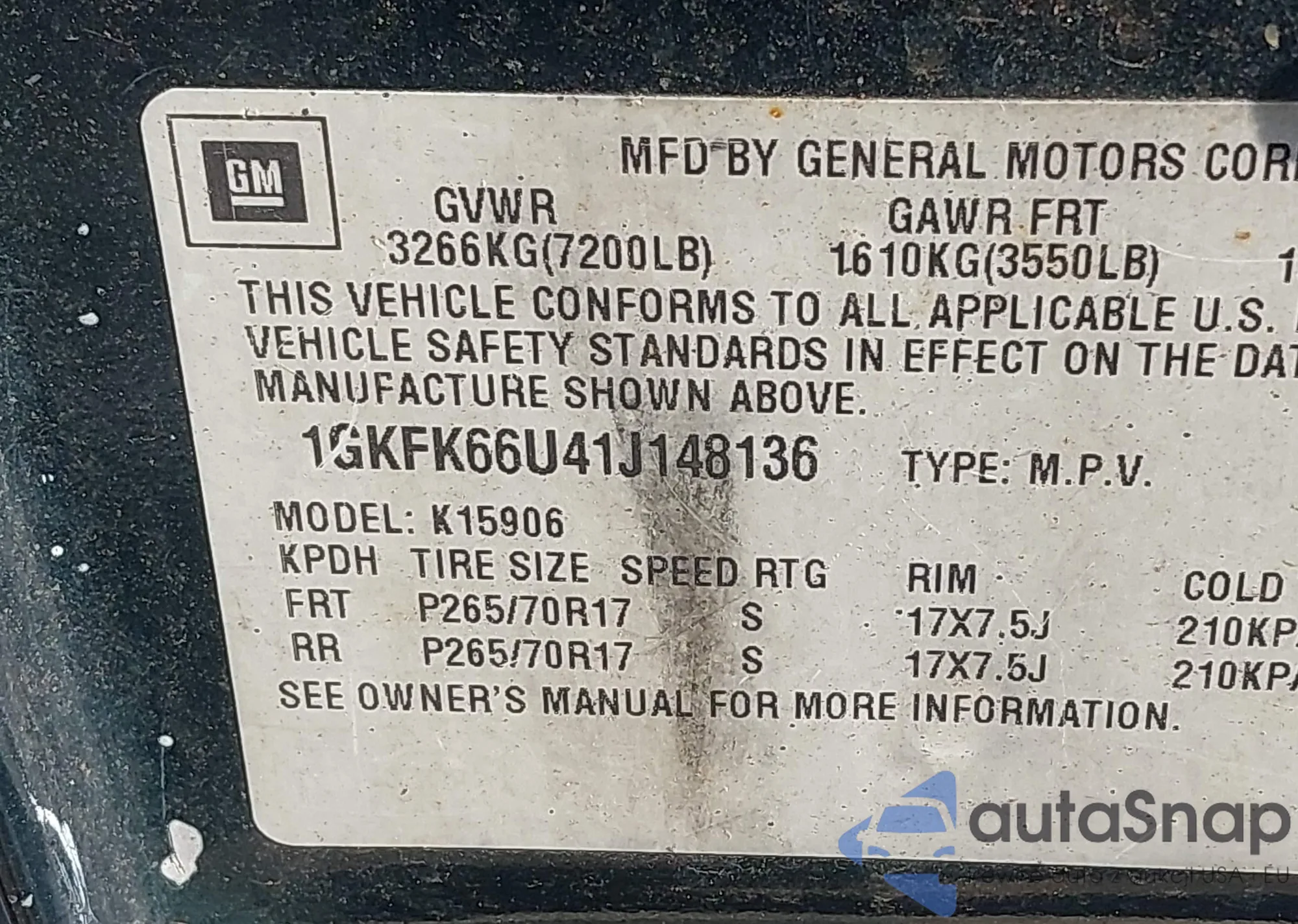 VIN: 1GKFK66U41J148136
