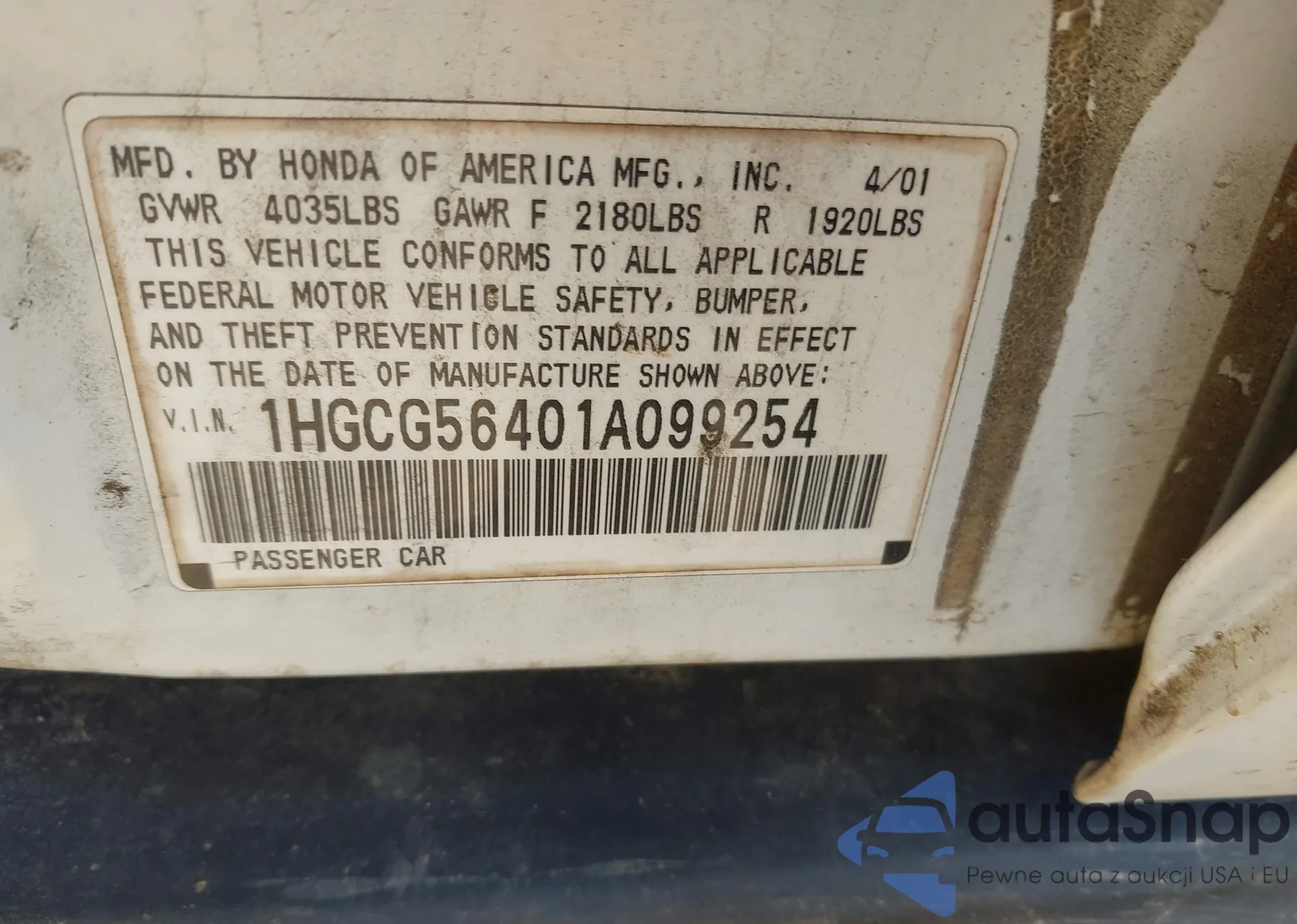 VIN: 1HGCG56401A099254