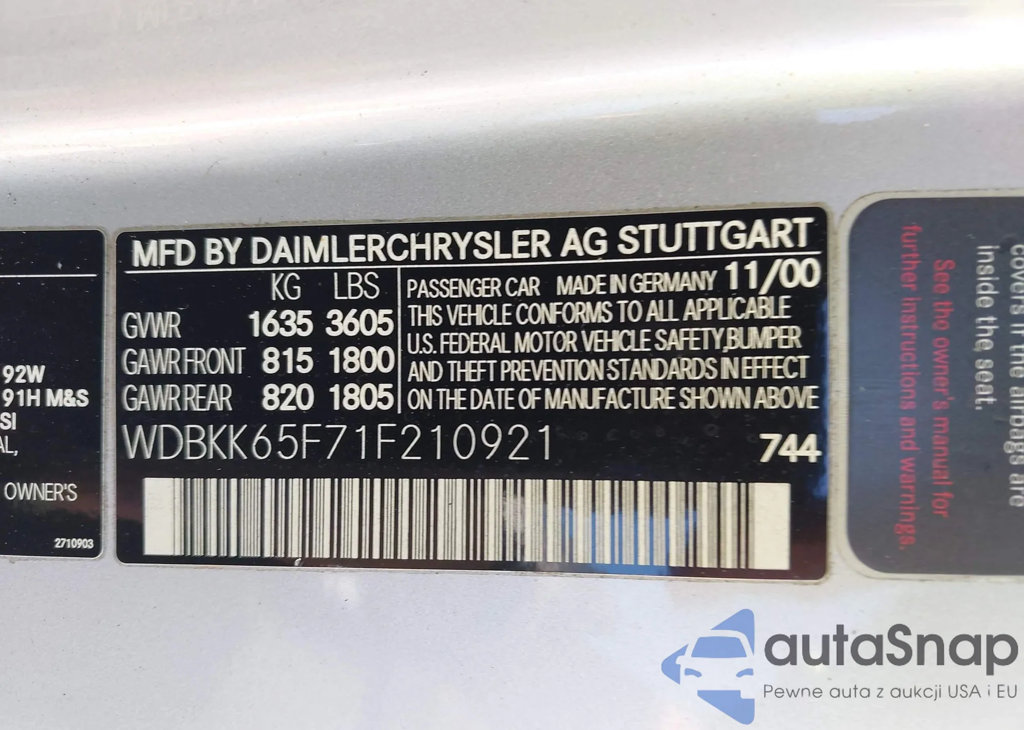 Автомобиль Mercedes-Benz SLK-klasse 2001 (VIN WDBKK65F71F210921) имеет документы, препятствующие регистрации. Могут возникнуть сложности при экспорте и регистрации. Обратитесь к экспертам AutaSnap для поиска альтернатив.
