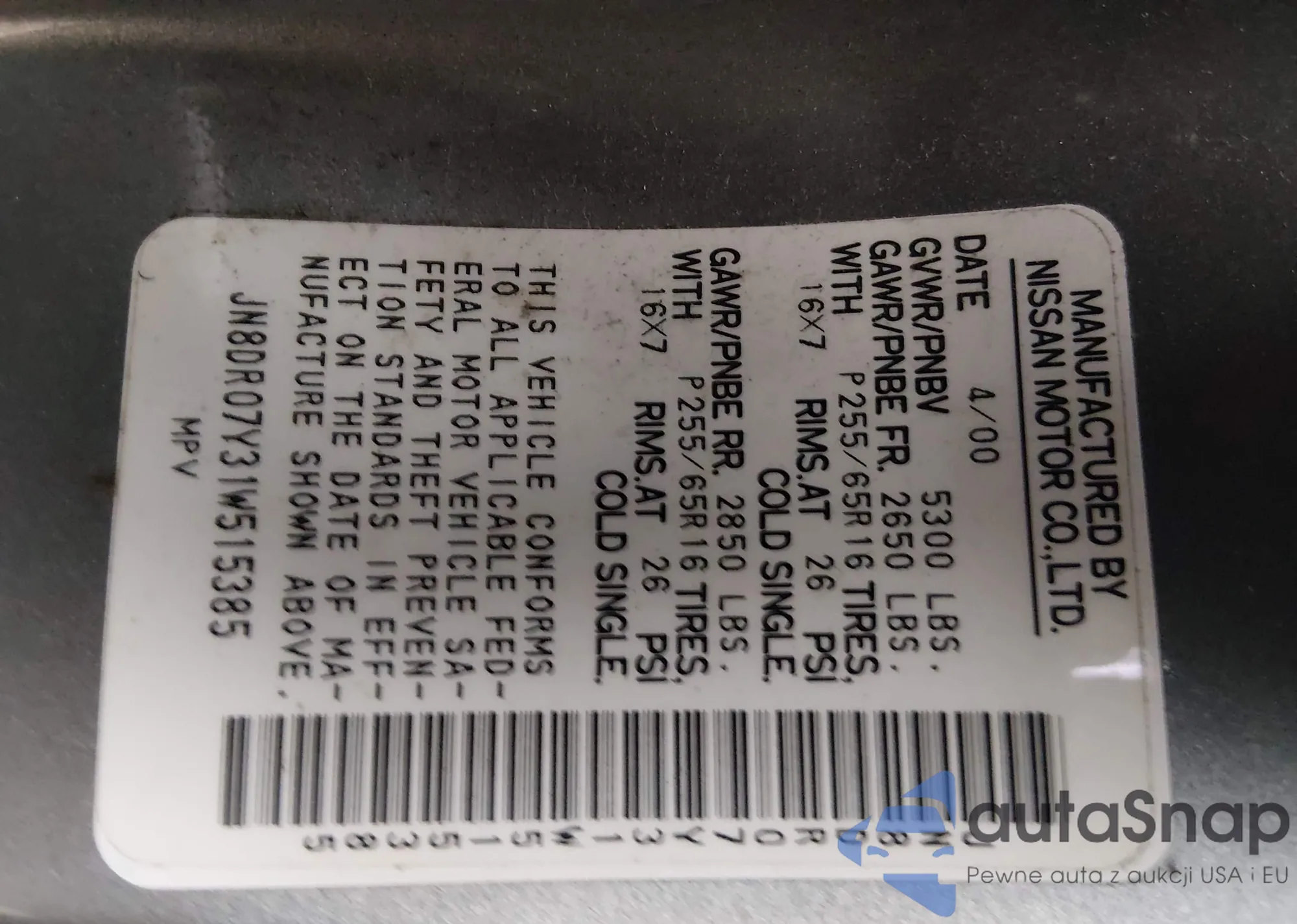 • VIN: JN8DR07Y31W515385