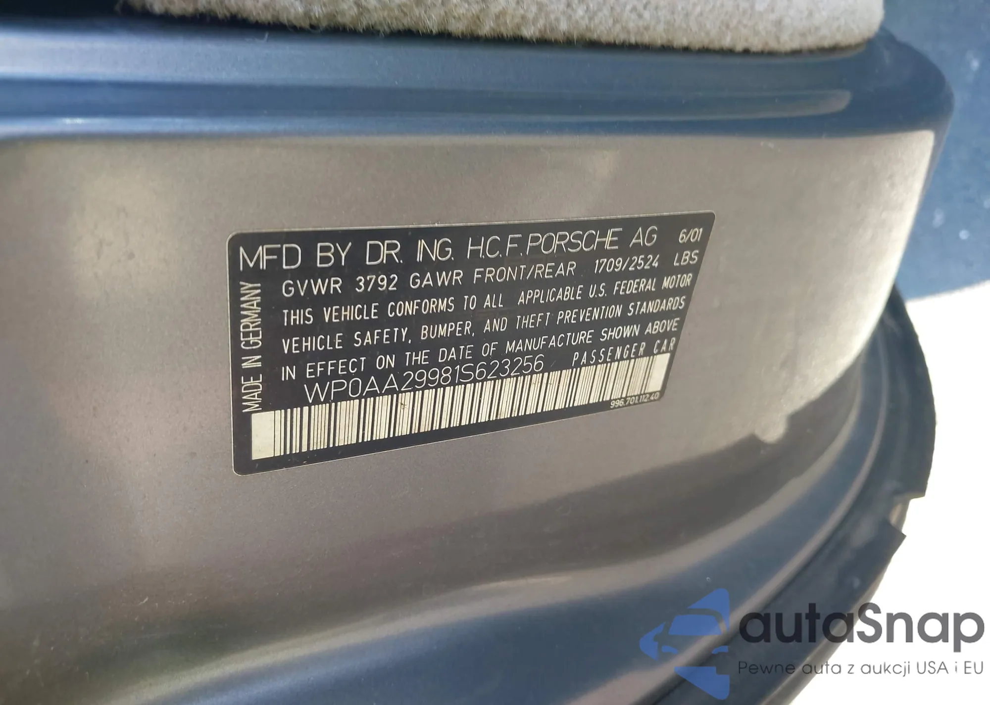 Автомобиль Porsche 911 2001 (VIN WP0AA29981S623256) ранее не участвовал в торгах. Документы чистые, пробег соответствует или ниже среднего по рынку. Продаётся страховой компанией — рекомендуем покупку. Доставка в порт займет около 6–8 недель.