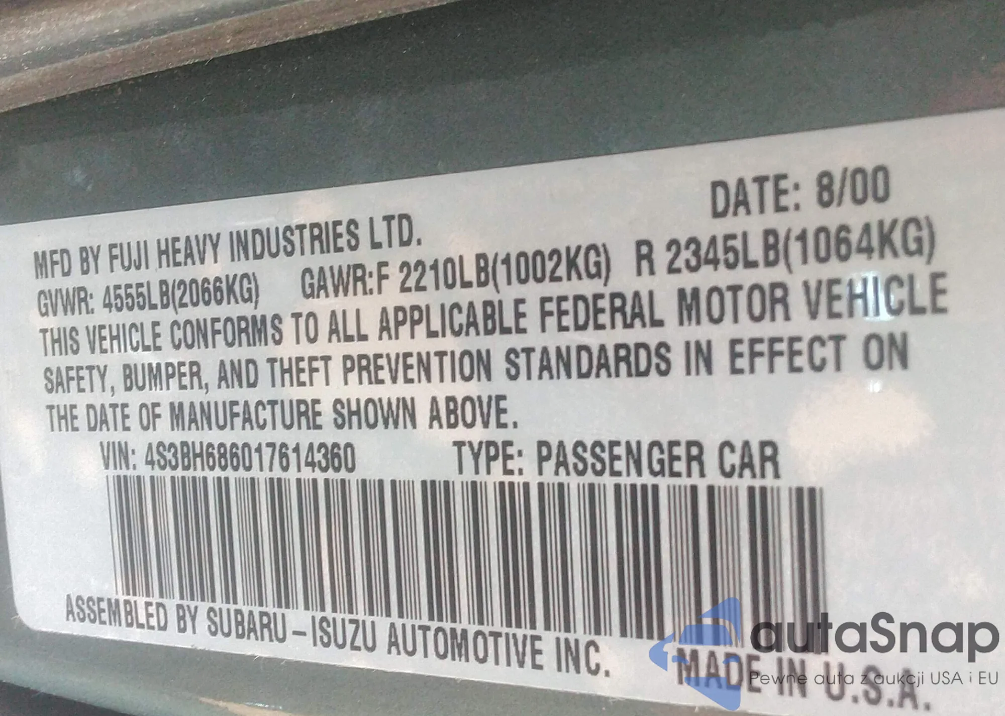 VIN: 4S3BH686017614360