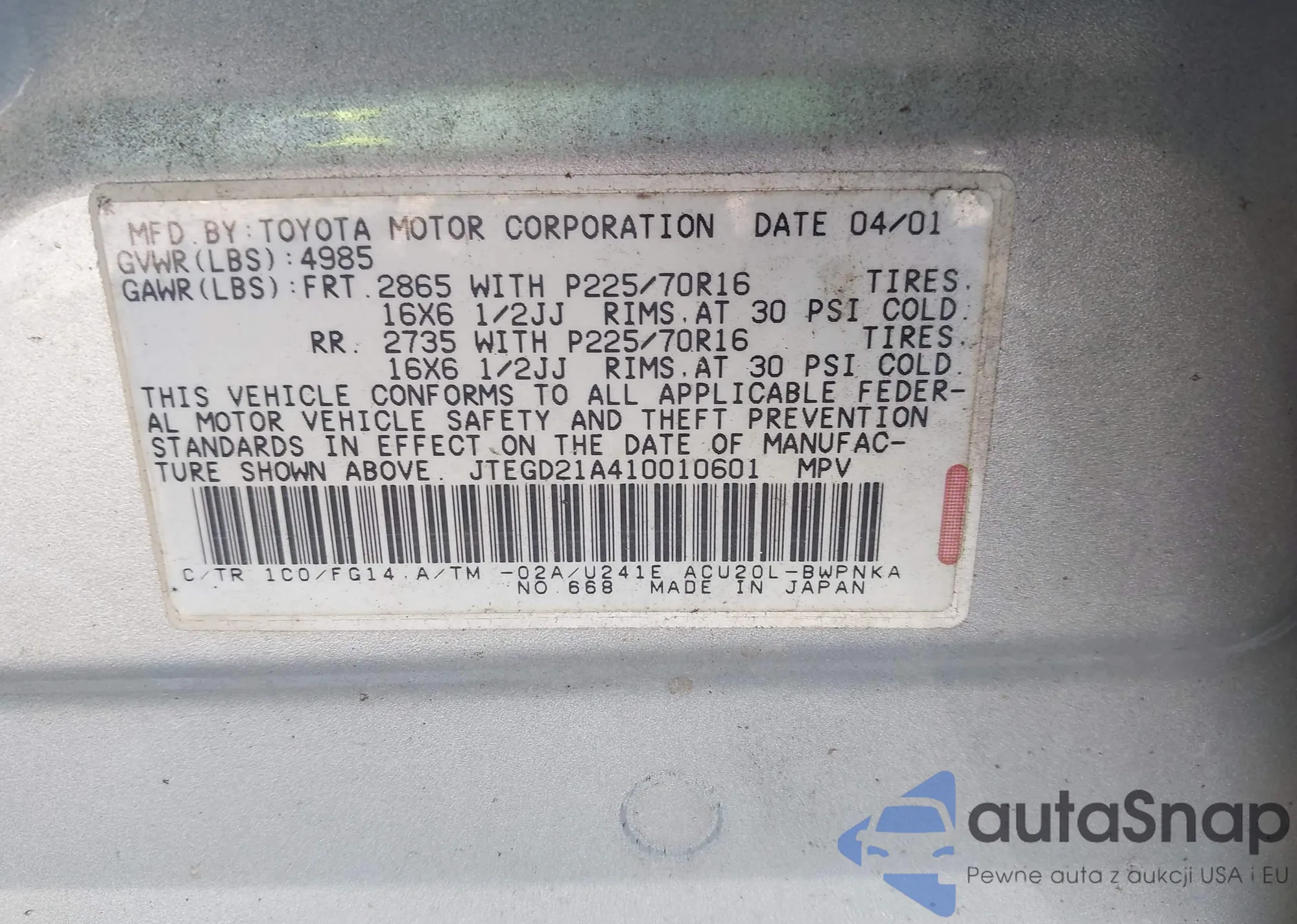 VIN: JTEGD21A410010601