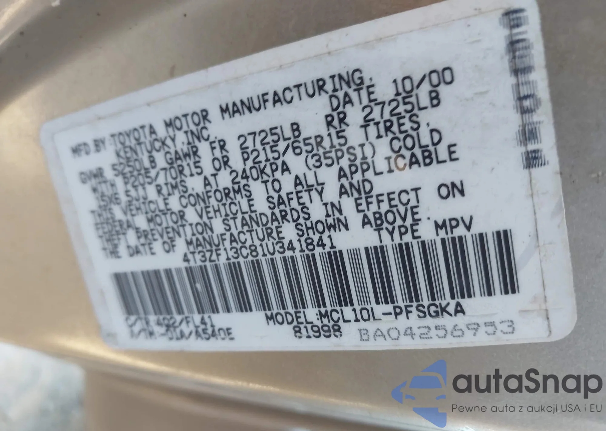 VIN: 4T3ZF13C81U341841