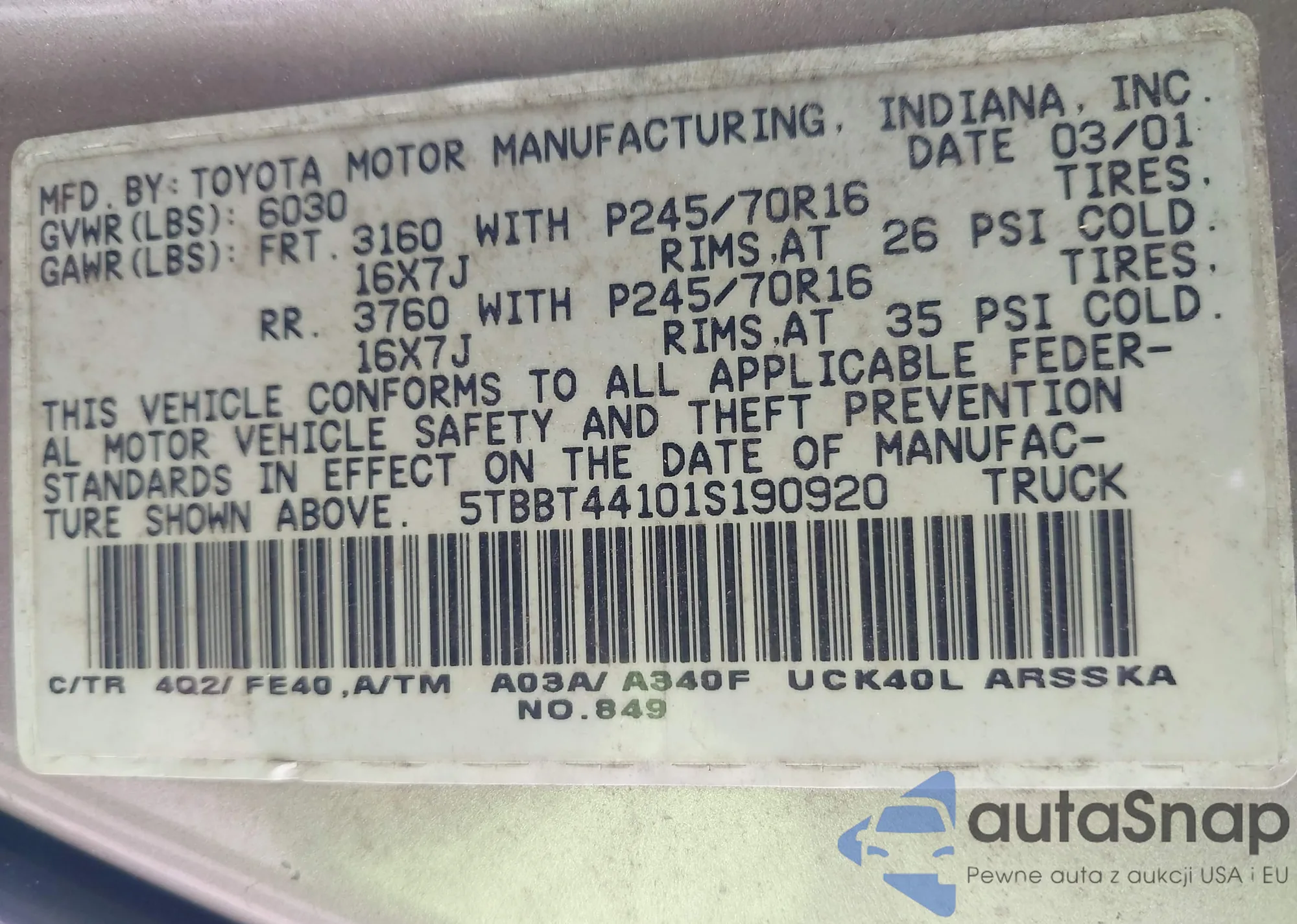 • VIN: 5TBBT44101S190920