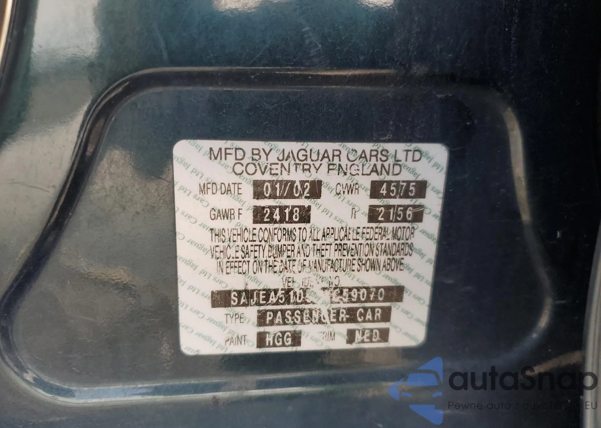 Автомобиль Jaguar X-Type 2002 (VIN SAJEA51D92XC59070) имеет документы, препятствующие регистрации. Могут возникнуть сложности при экспорте и регистрации. Обратитесь к экспертам AutaSnap для поиска альтернатив.