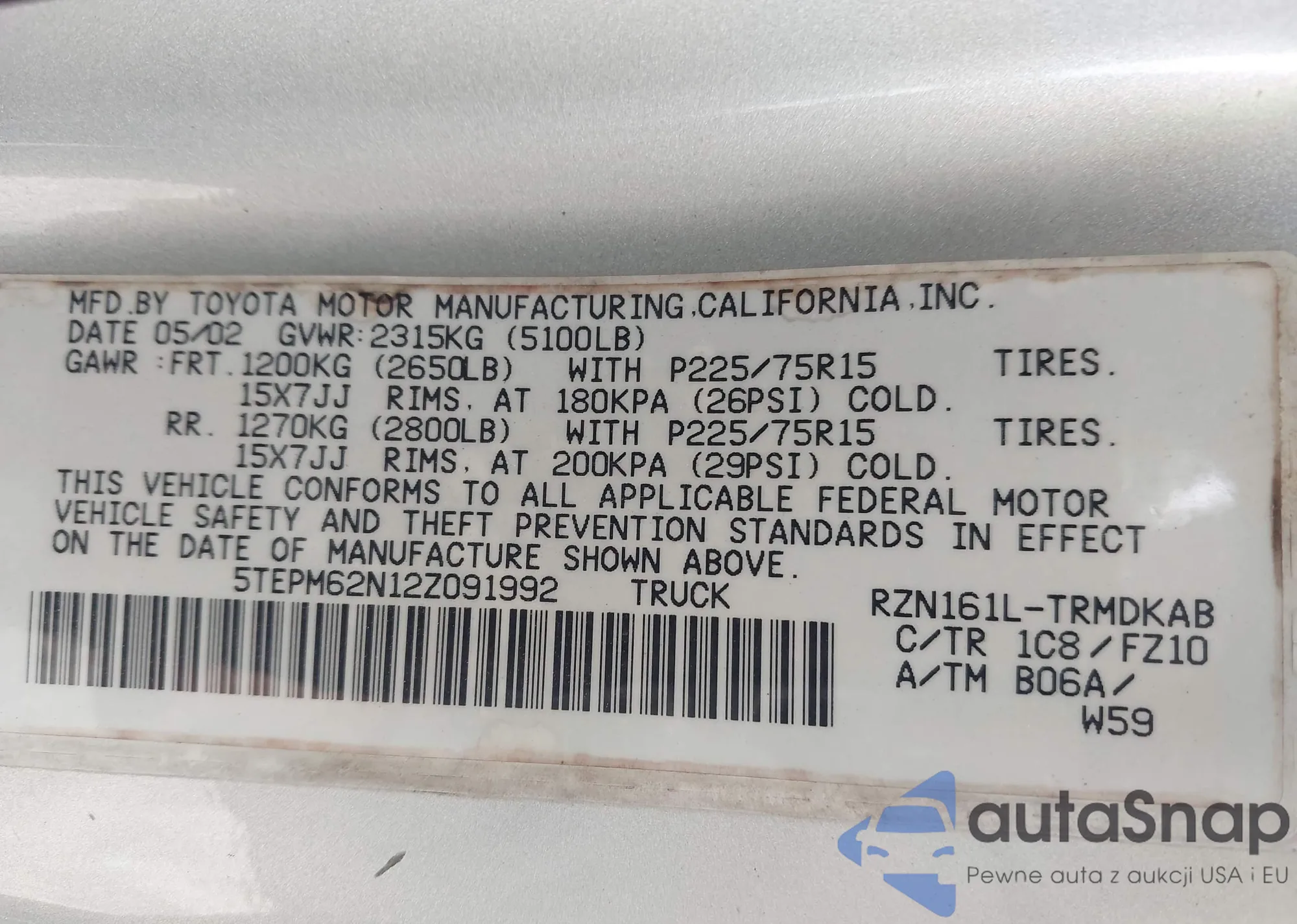 Автомобиль Toyota Tacoma 2002 (VIN 5TEPM62N12Z091992) ранее не участвовал в торгах. Документы чистые, пробег соответствует или ниже среднего по рынку. Продаётся страховой компанией — рекомендуем покупку. Доставка в порт займет около 6–8 недель.
