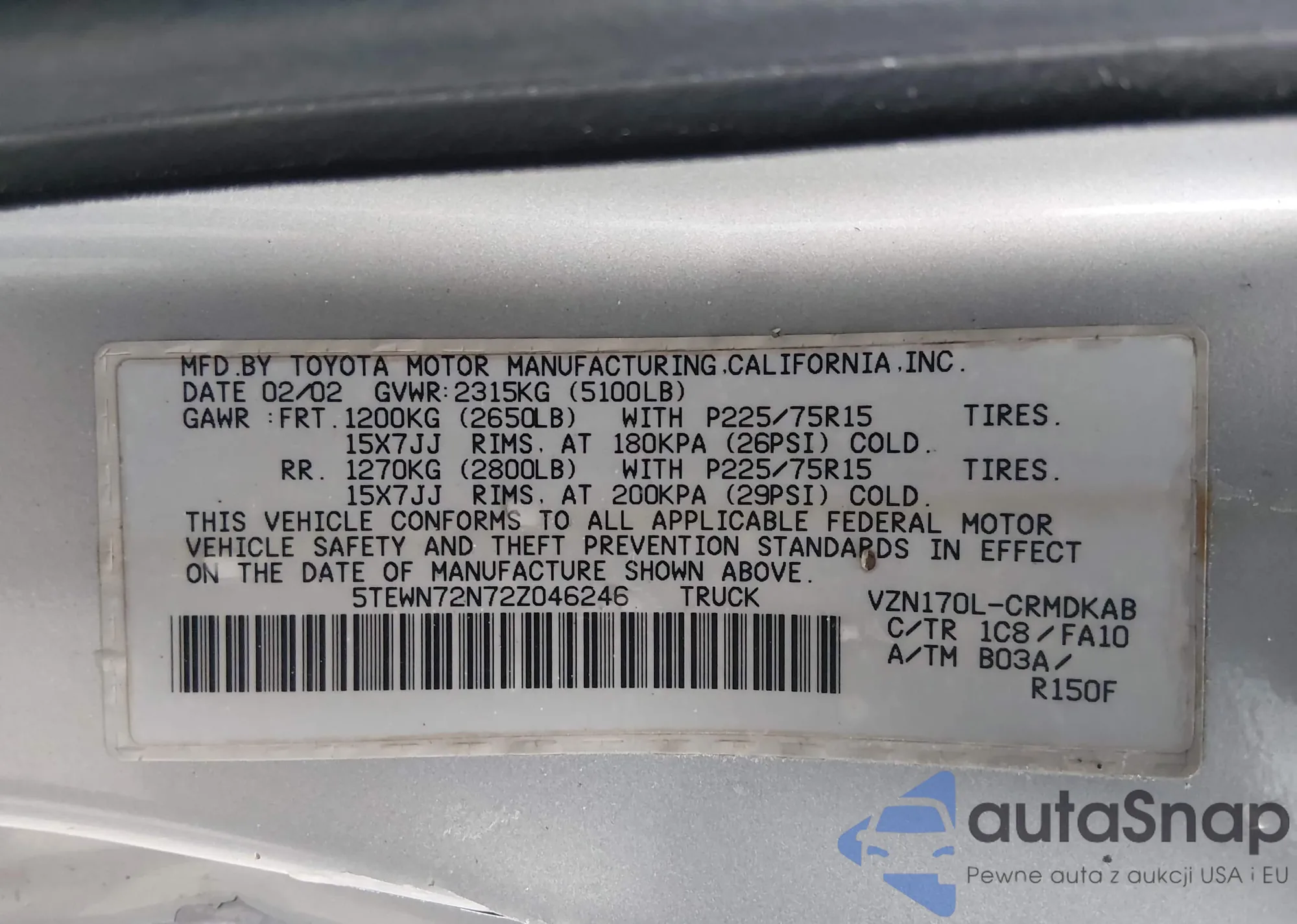 Автомобиль Toyota Tacoma 2002 (VIN 5TEWN72N72Z046246) имеет документы, препятствующие регистрации. Могут возникнуть сложности при экспорте и регистрации. Обратитесь к экспертам AutaSnap для поиска альтернатив.