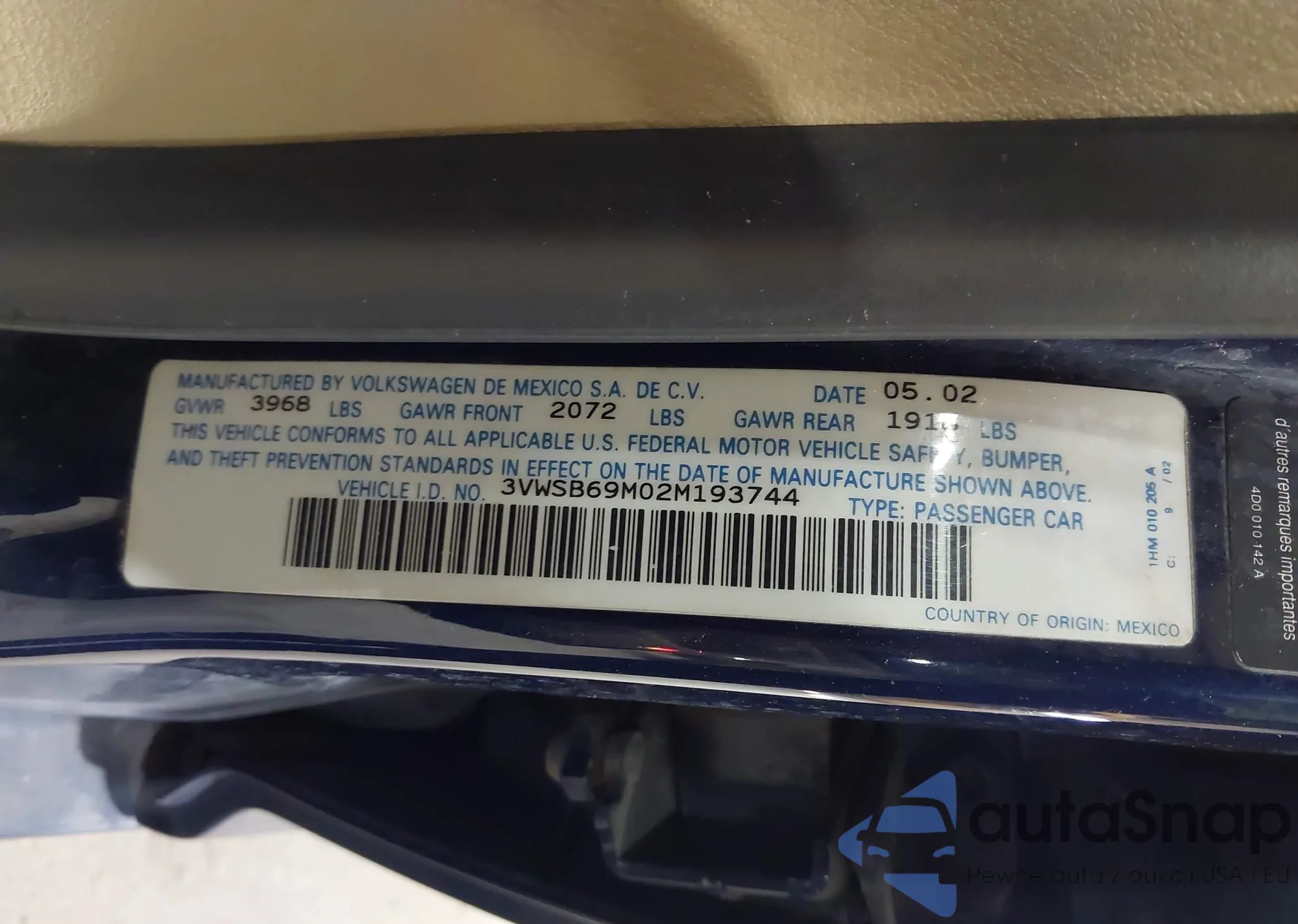 Автомобиль Volkswagen Jetta 2002 (VIN 3VWSB69M02M193744) имеет документы, препятствующие регистрации. Могут возникнуть сложности при экспорте и регистрации. Обратитесь к экспертам AutaSnap для поиска альтернатив.