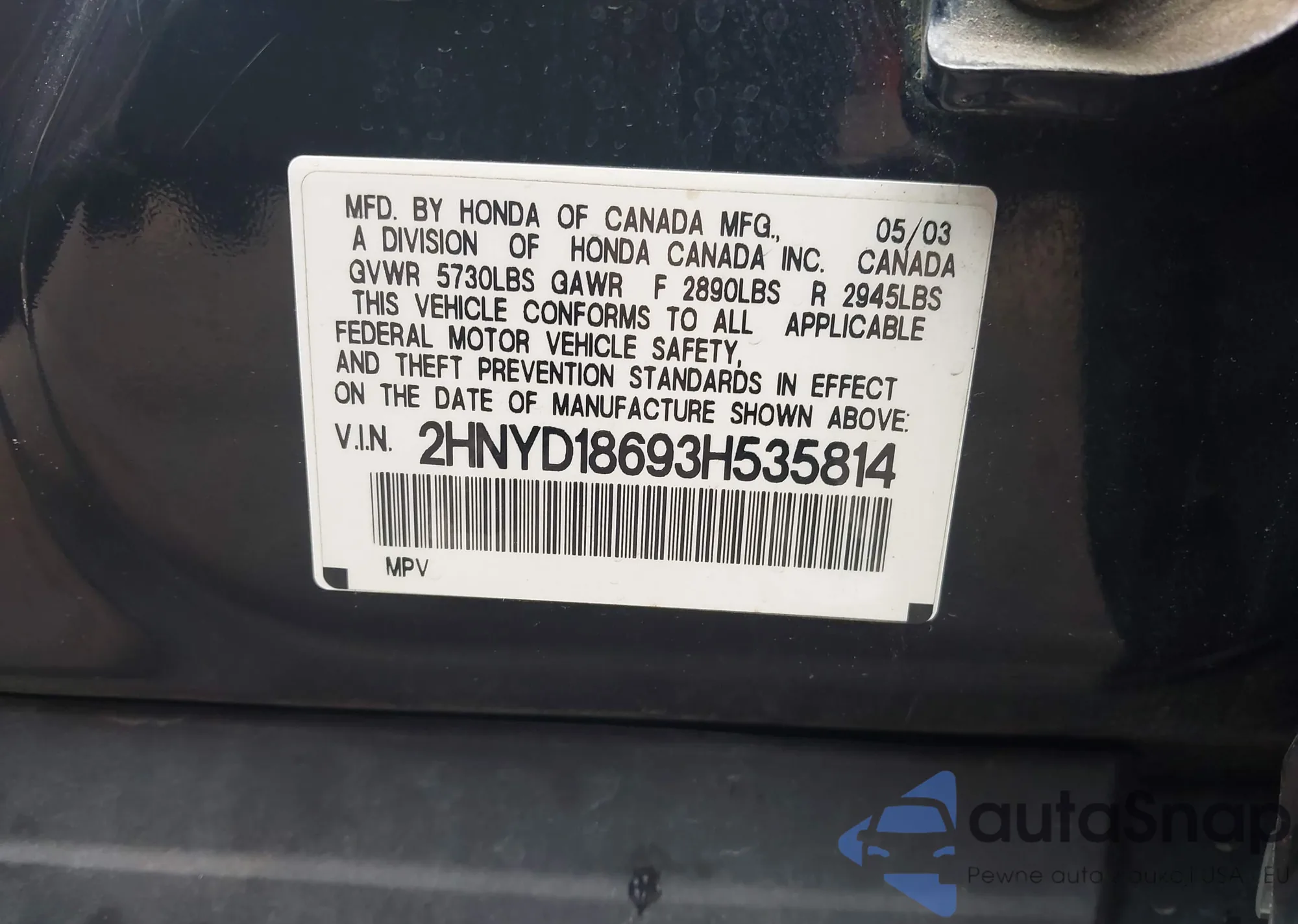 Автомобиль Acura MDX 2003 (VIN 2HNYD18693H535814) имеет документы, препятствующие регистрации. Могут возникнуть сложности при экспорте и регистрации. Обратитесь к экспертам AutaSnap для поиска альтернатив.