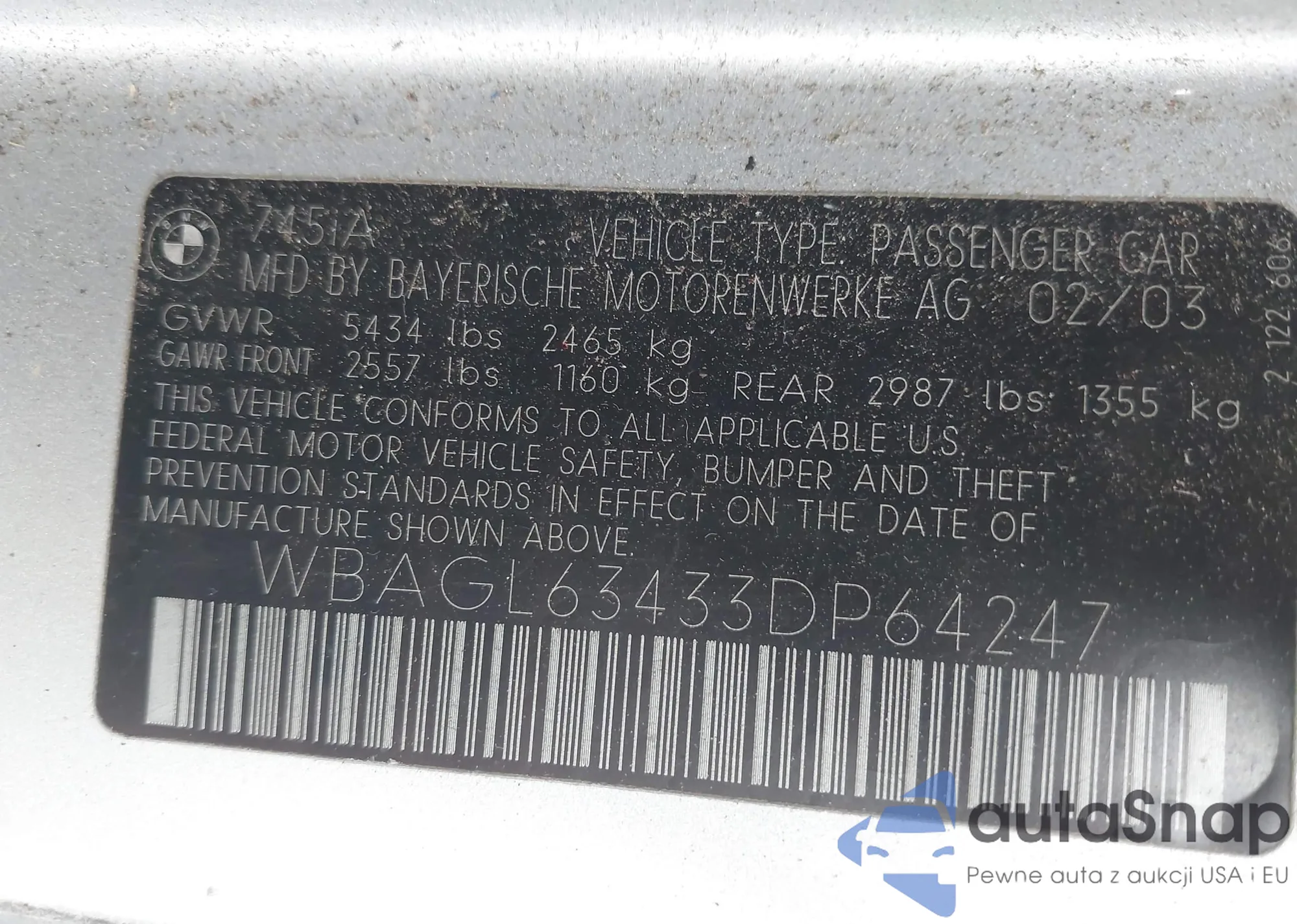 • VIN: WBAGL63433DP64247