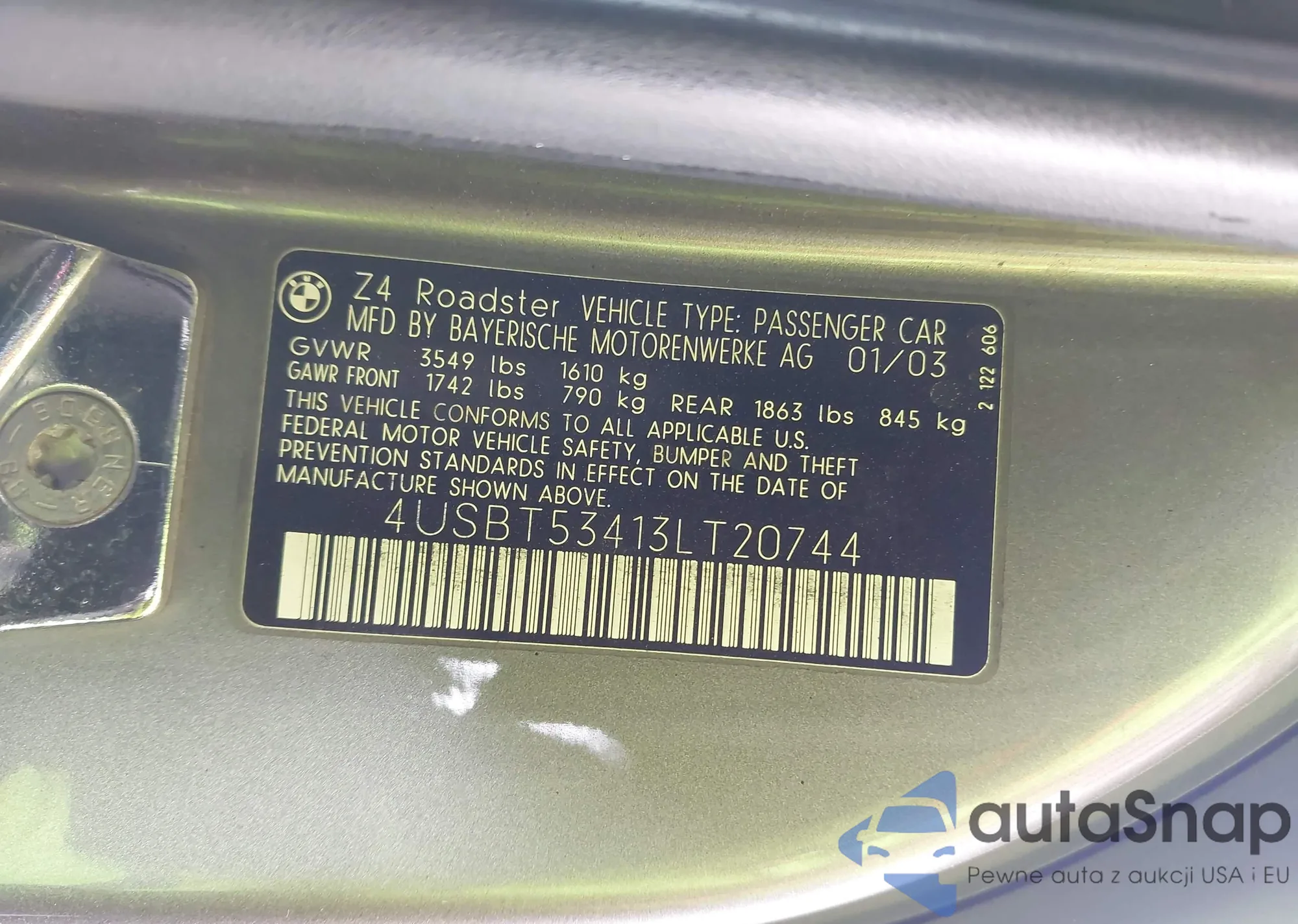 Автомобиль BMW Z4 2003 (VIN 4USBT53413LT20744) имеет документы, препятствующие регистрации. Могут возникнуть сложности при экспорте и регистрации. Обратитесь к экспертам AutaSnap для поиска альтернатив.