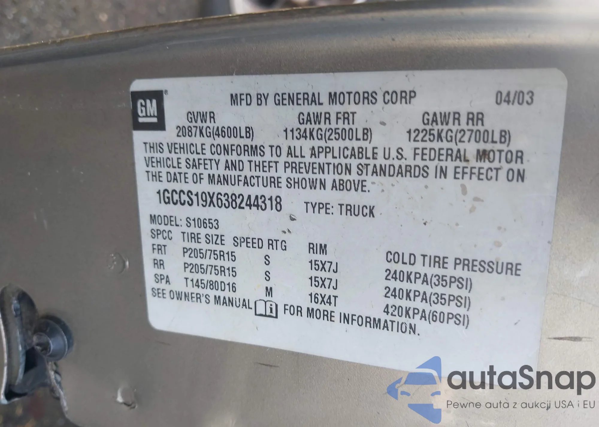 VIN: 1GCCS19X638244318