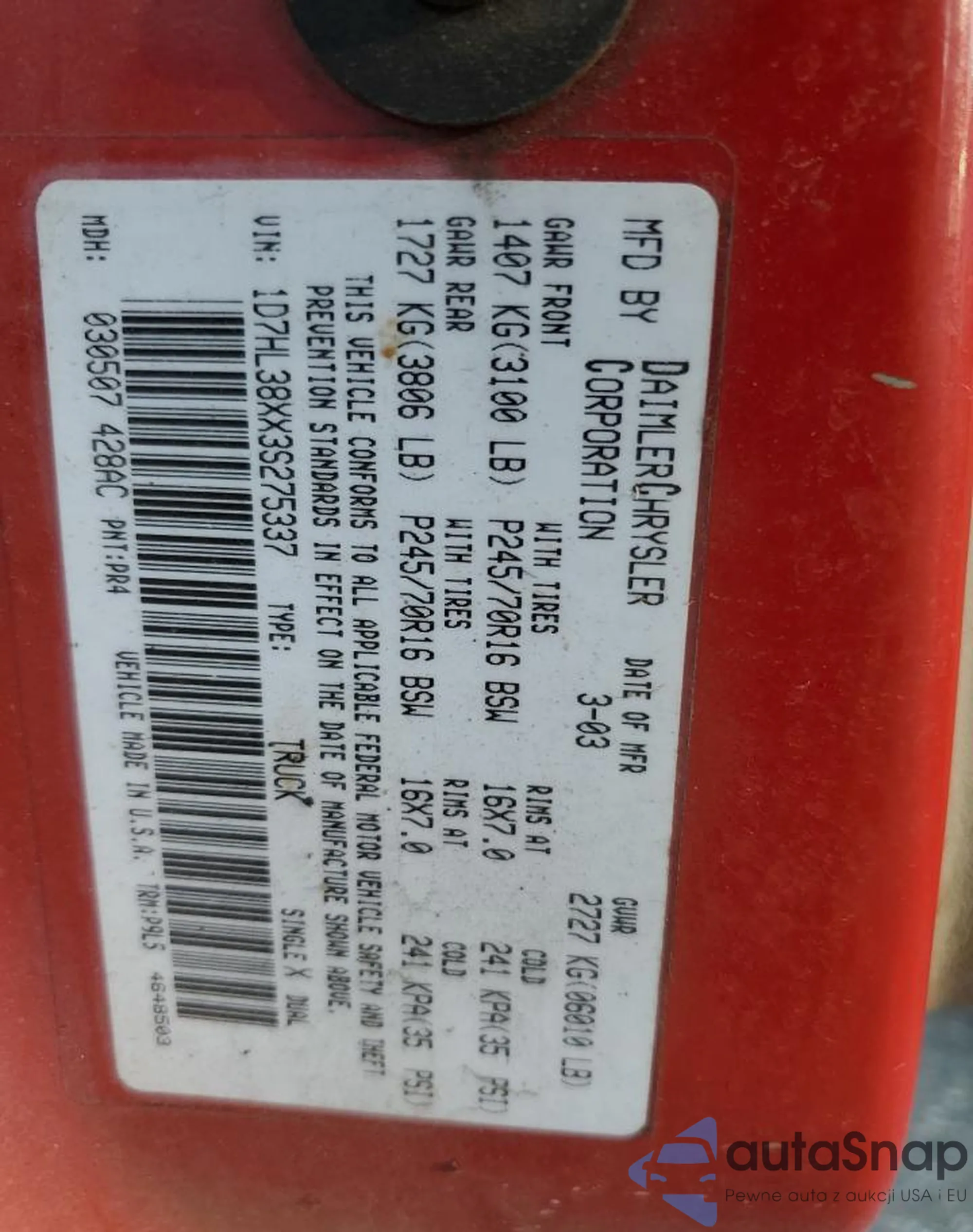 Автомобиль Dodge Dakota 2003 (VIN 1D7HL38XX3S275337) имеет документы, препятствующие регистрации. Могут возникнуть сложности при экспорте и регистрации. Обратитесь к экспертам AutaSnap для поиска альтернатив.