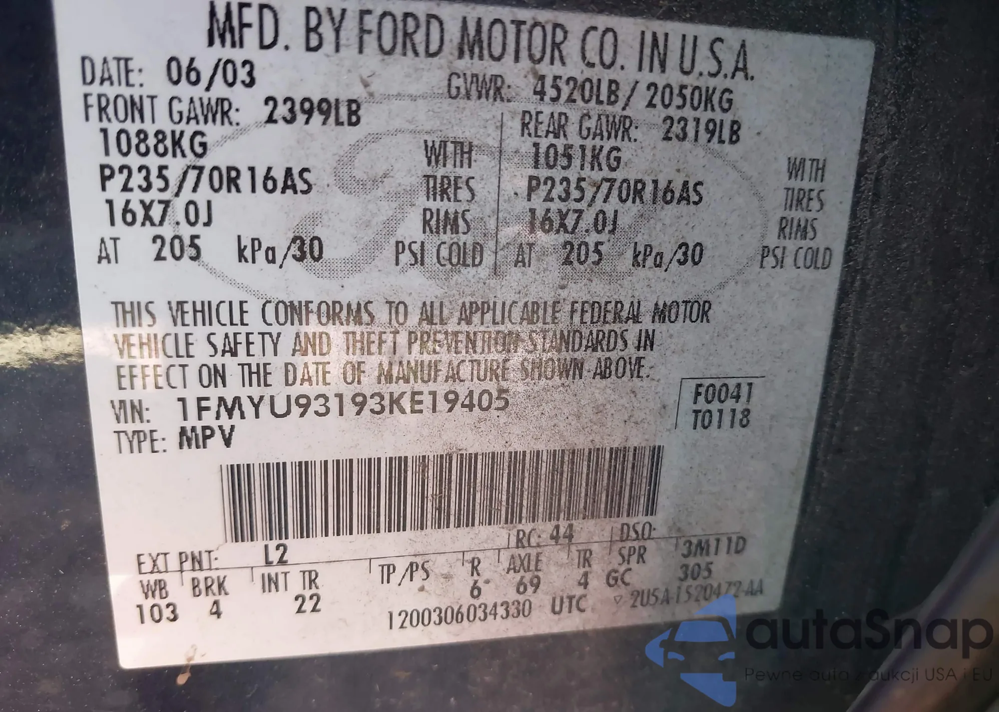 VIN: 1FMYU93193KE19405