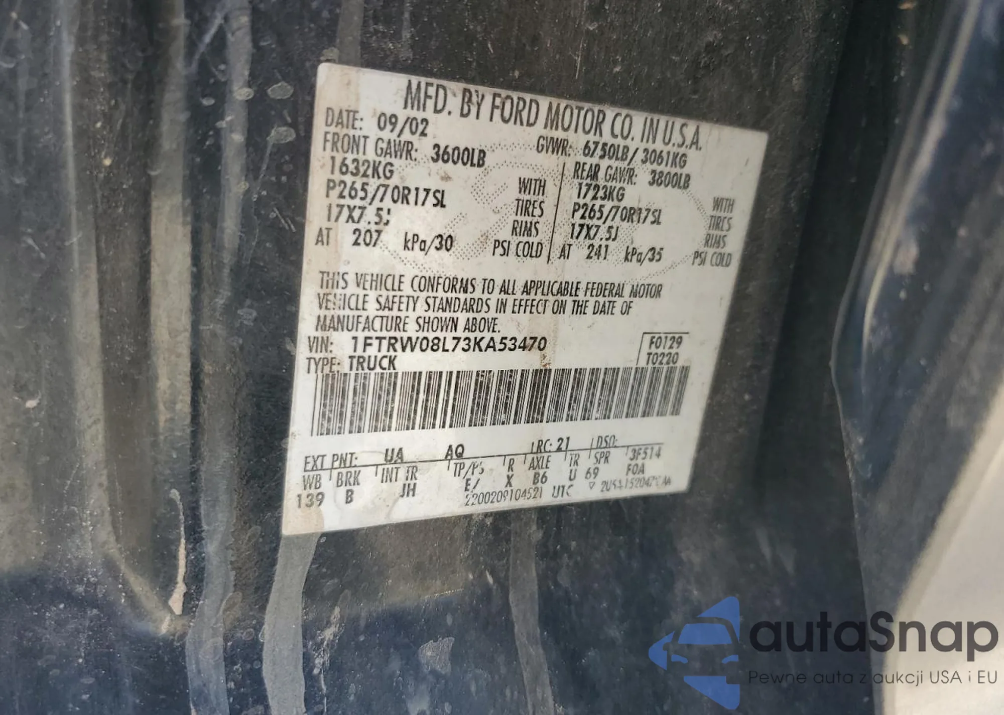 • VIN: 1FTRW08L73KA53470