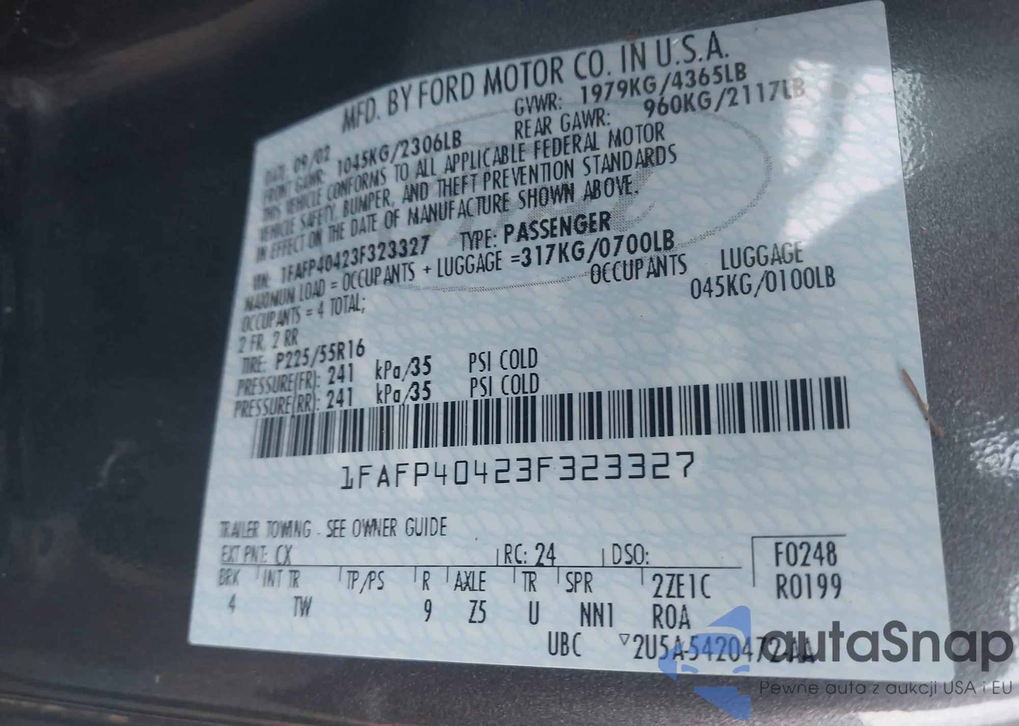 • VIN: 1FAFP40423F323327