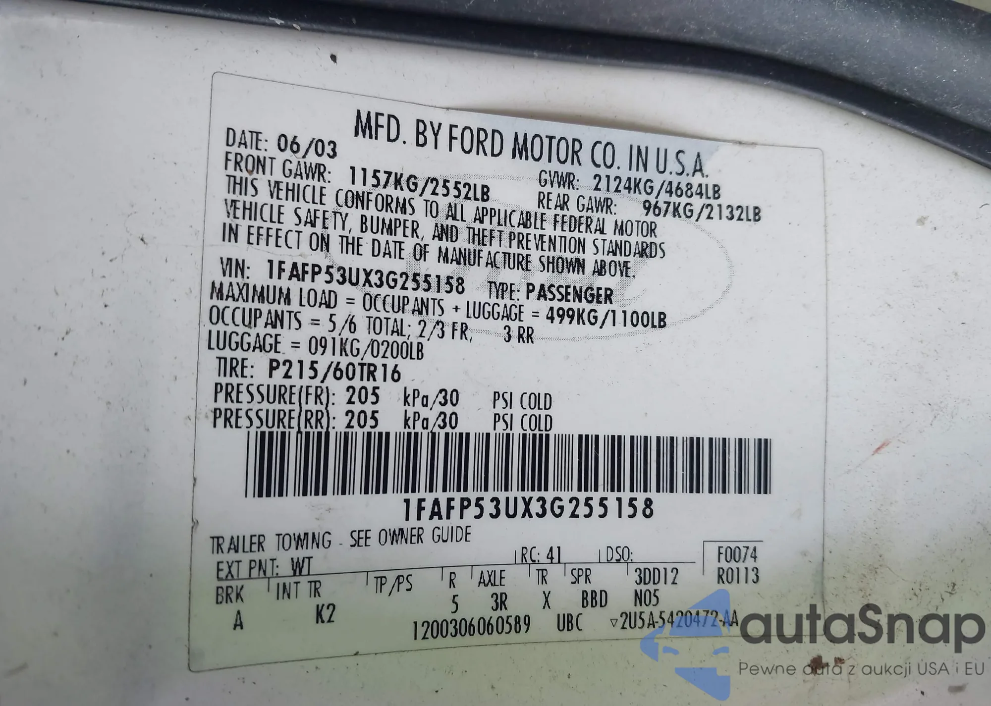 VIN: 1FAFP53UX3G255158
