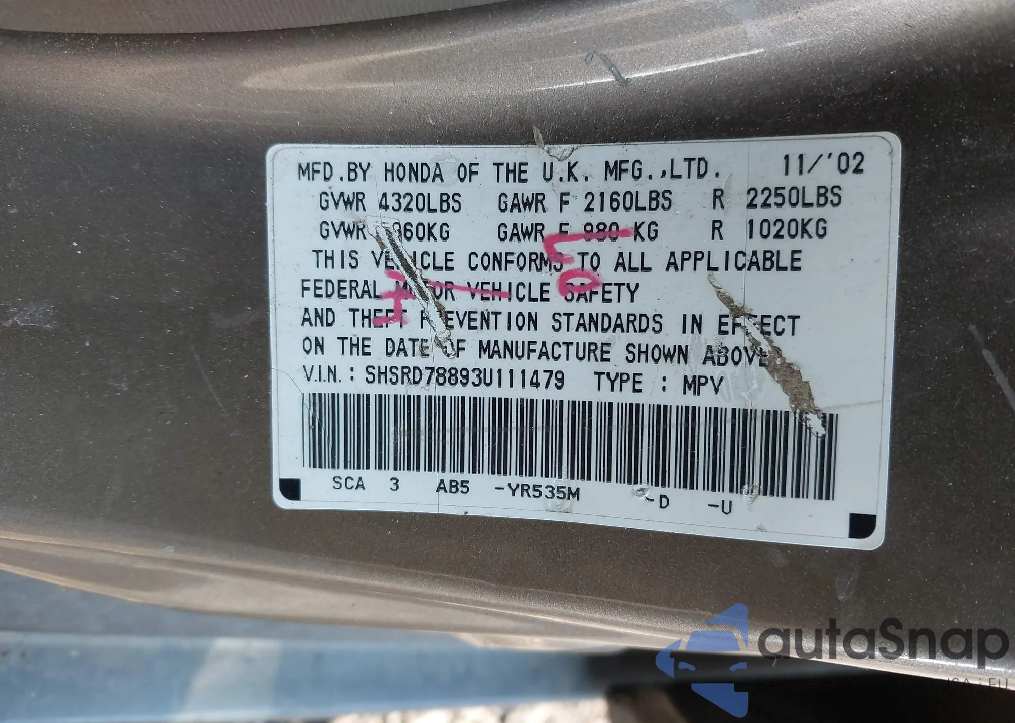 • VIN: SHSRD78893U111479