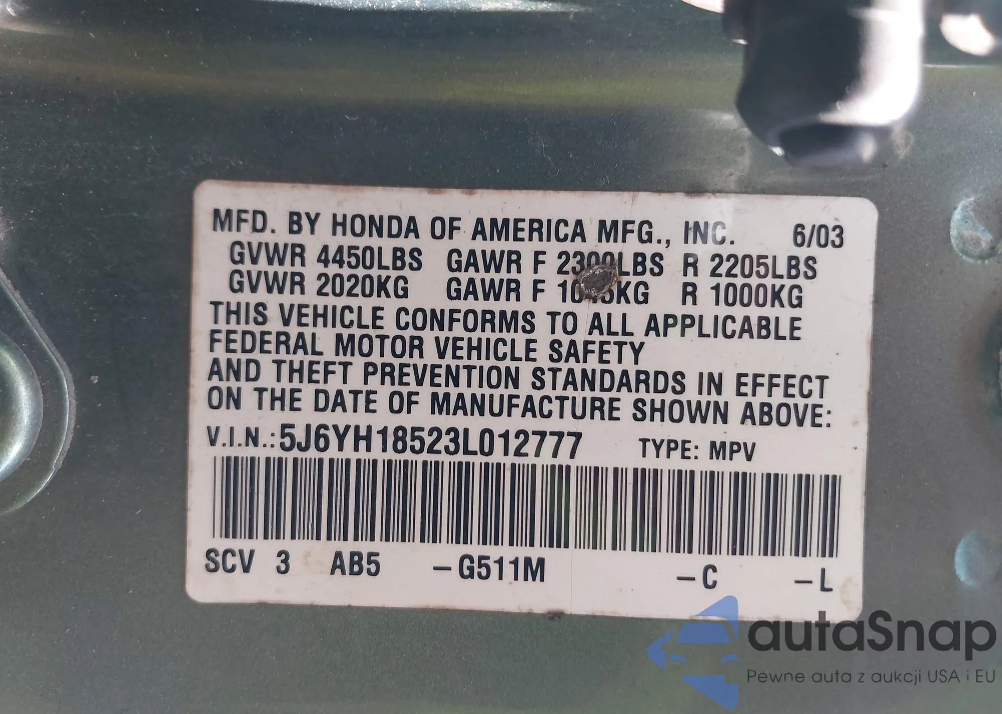 VIN: 5J6YH18523L012777