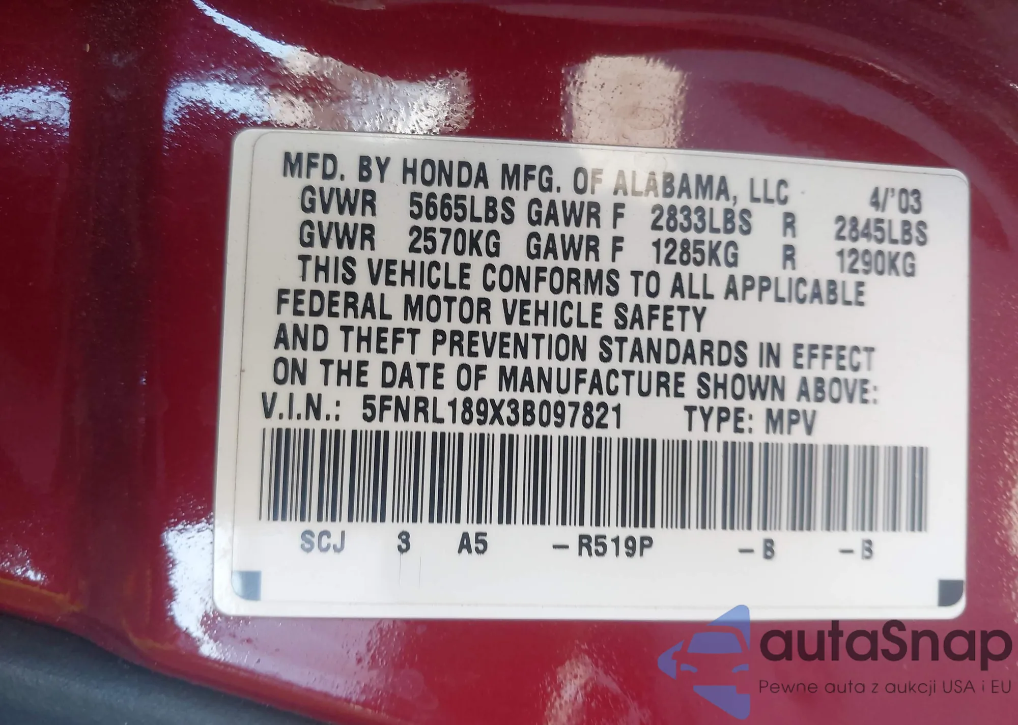 VIN: 5FNRL189X3B097821