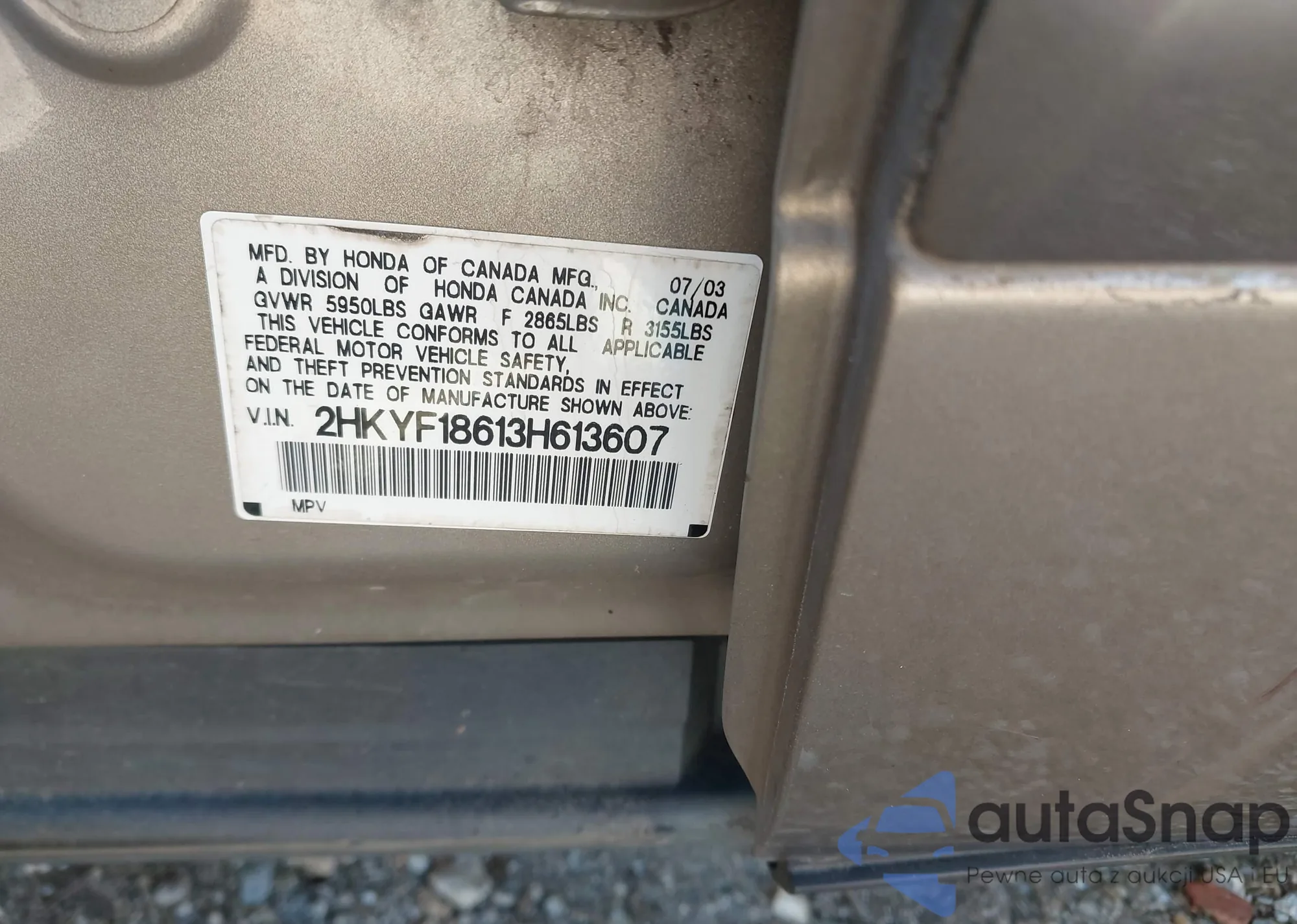 VIN: 2HKYF18613H613607