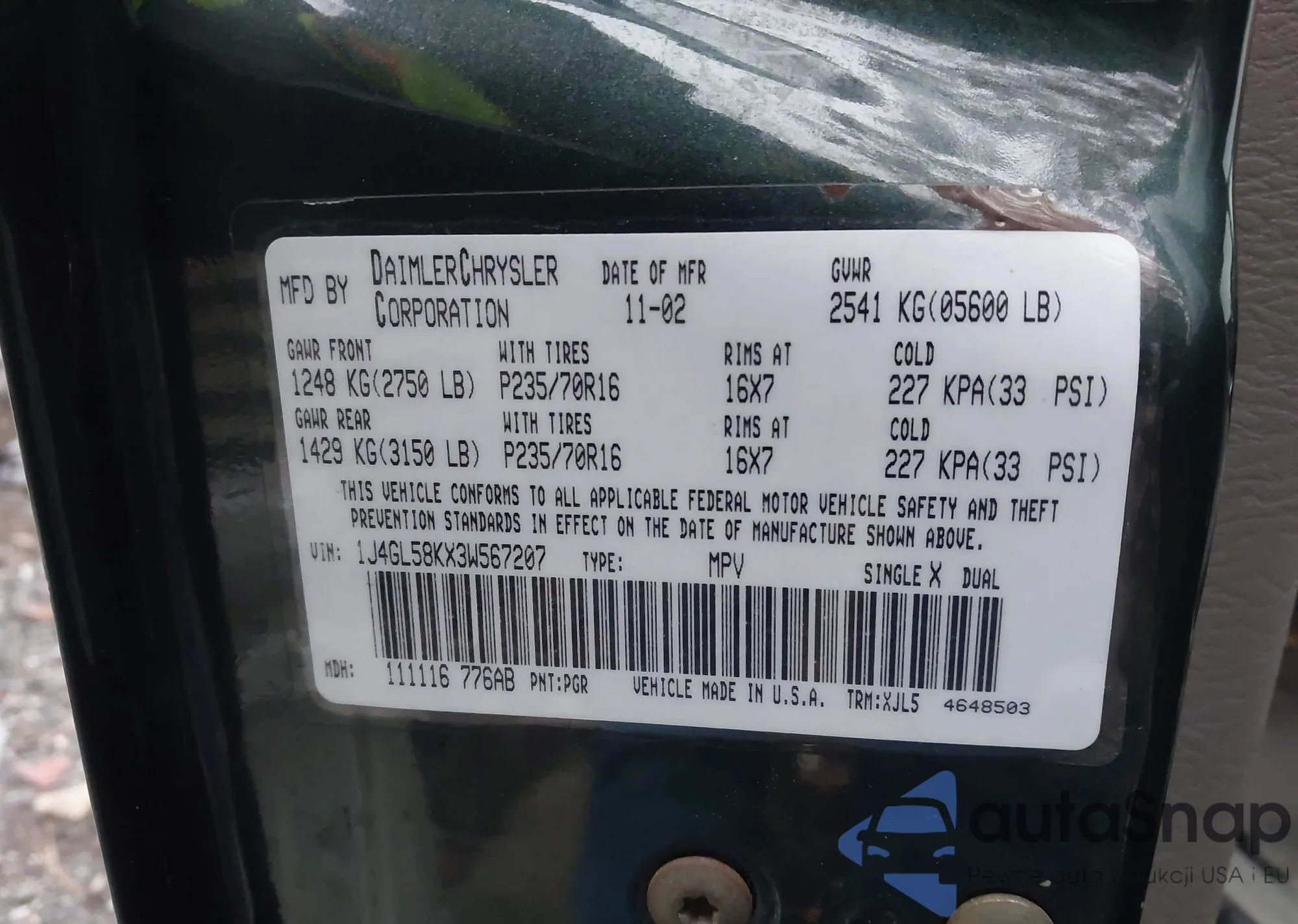 VIN: 1J4GL58KX3W567207