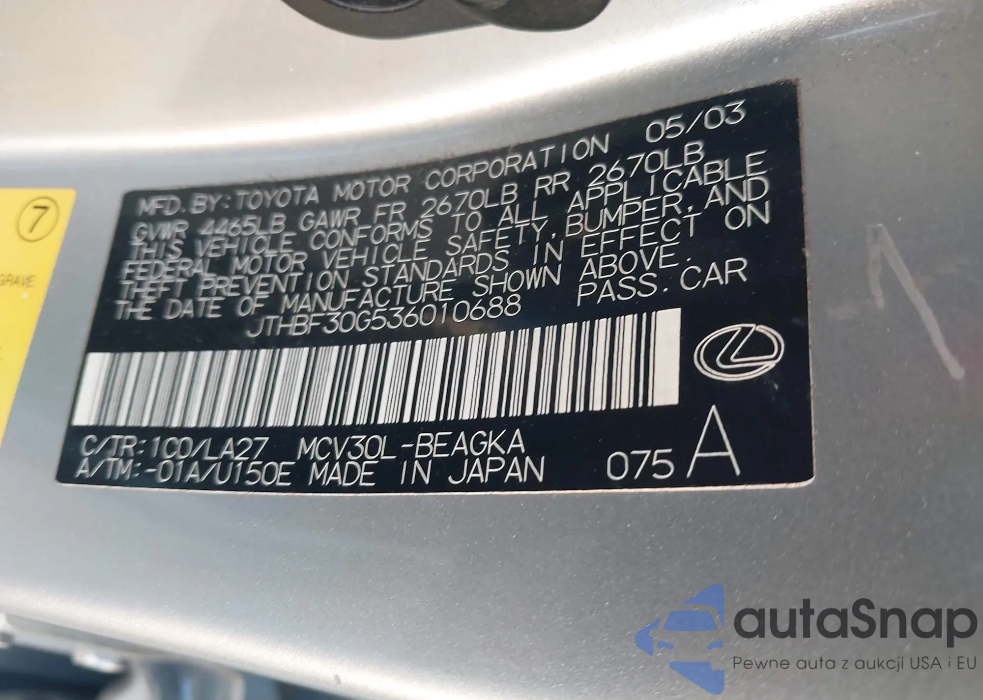 • VIN: JTHBF30G536010688