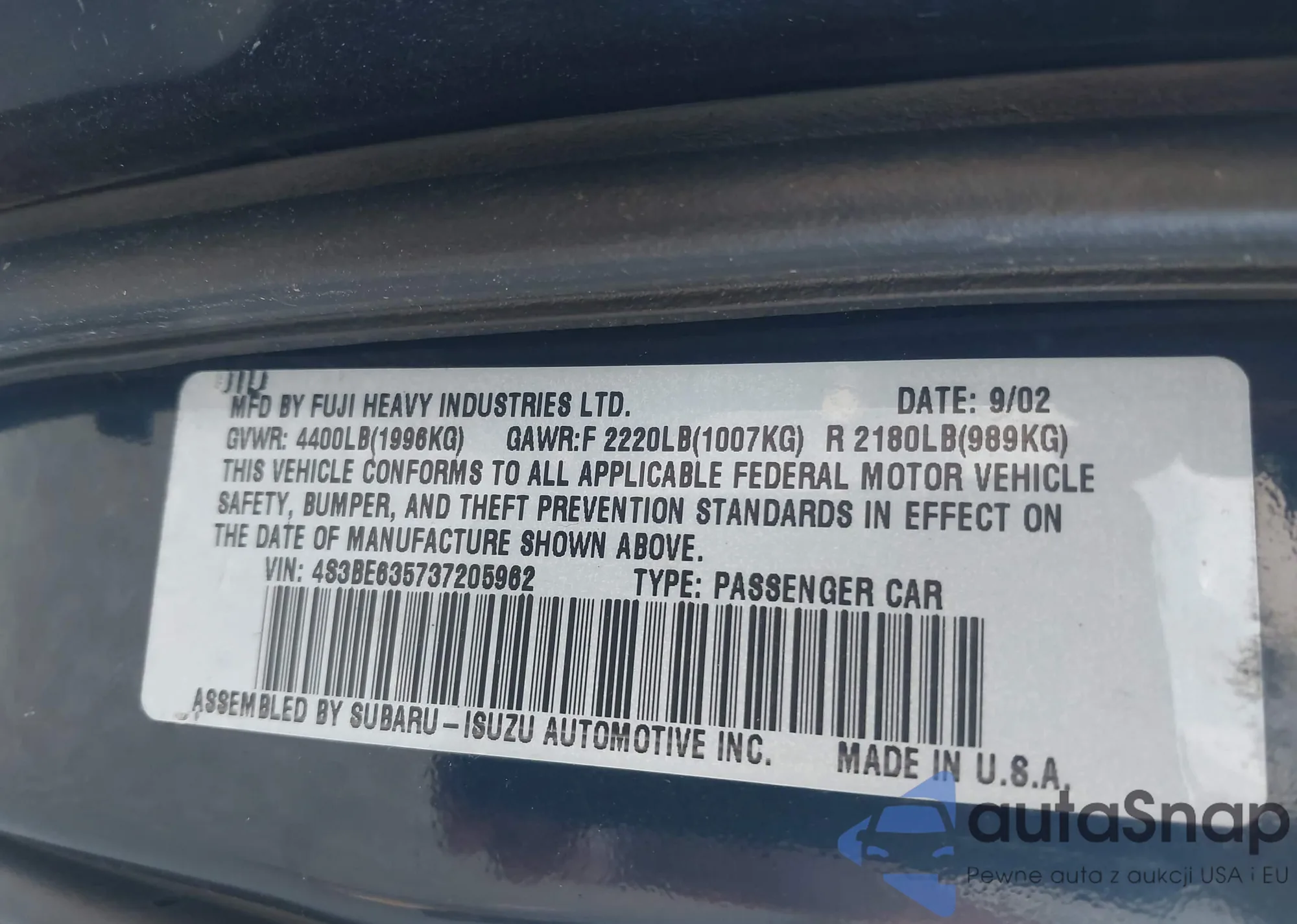 VIN: 4S3BE635737205962