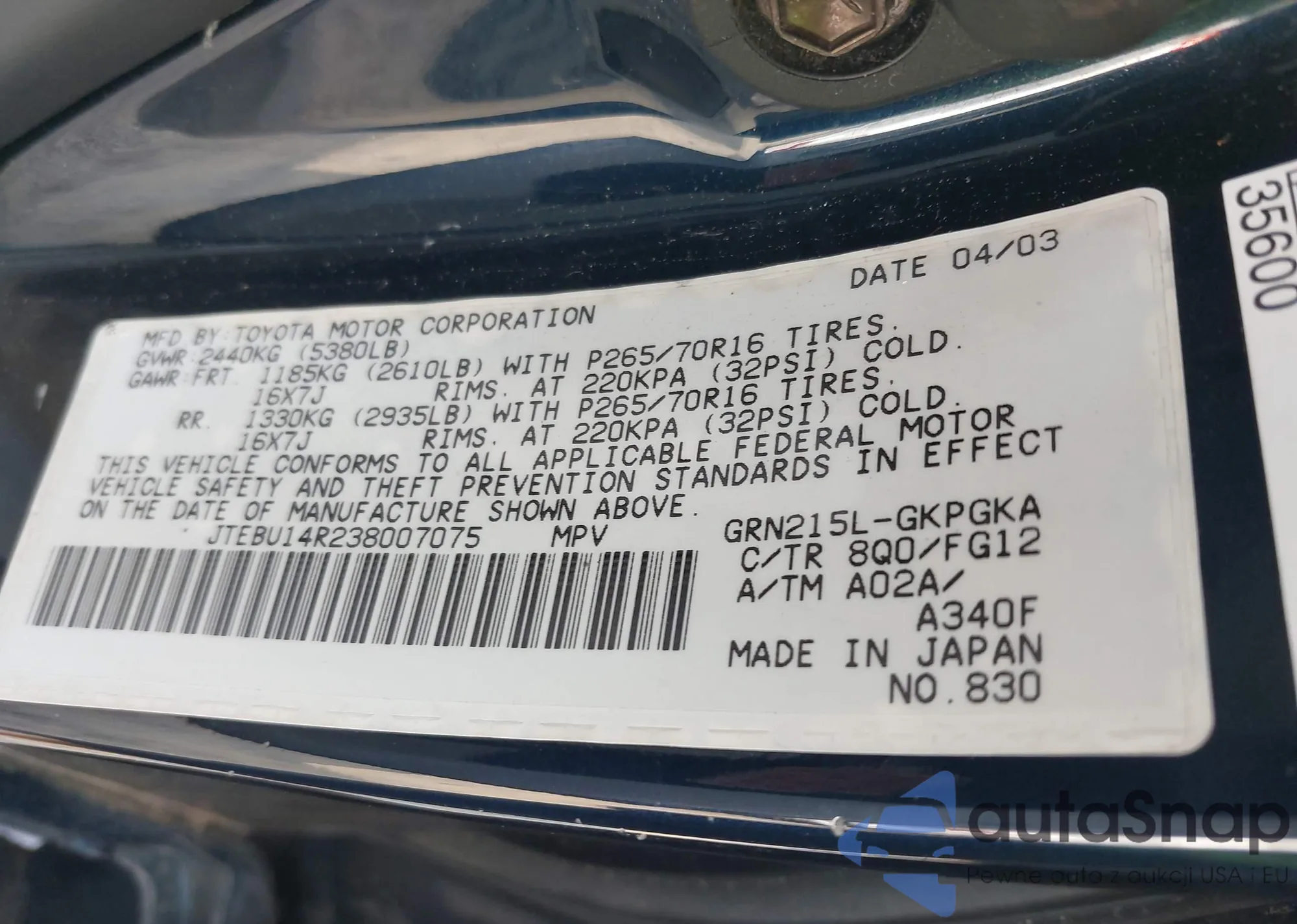 VIN: JTEBU14R238007075