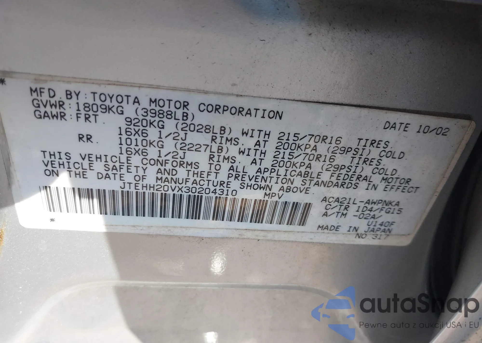 VIN: JTEHH20VX30204310