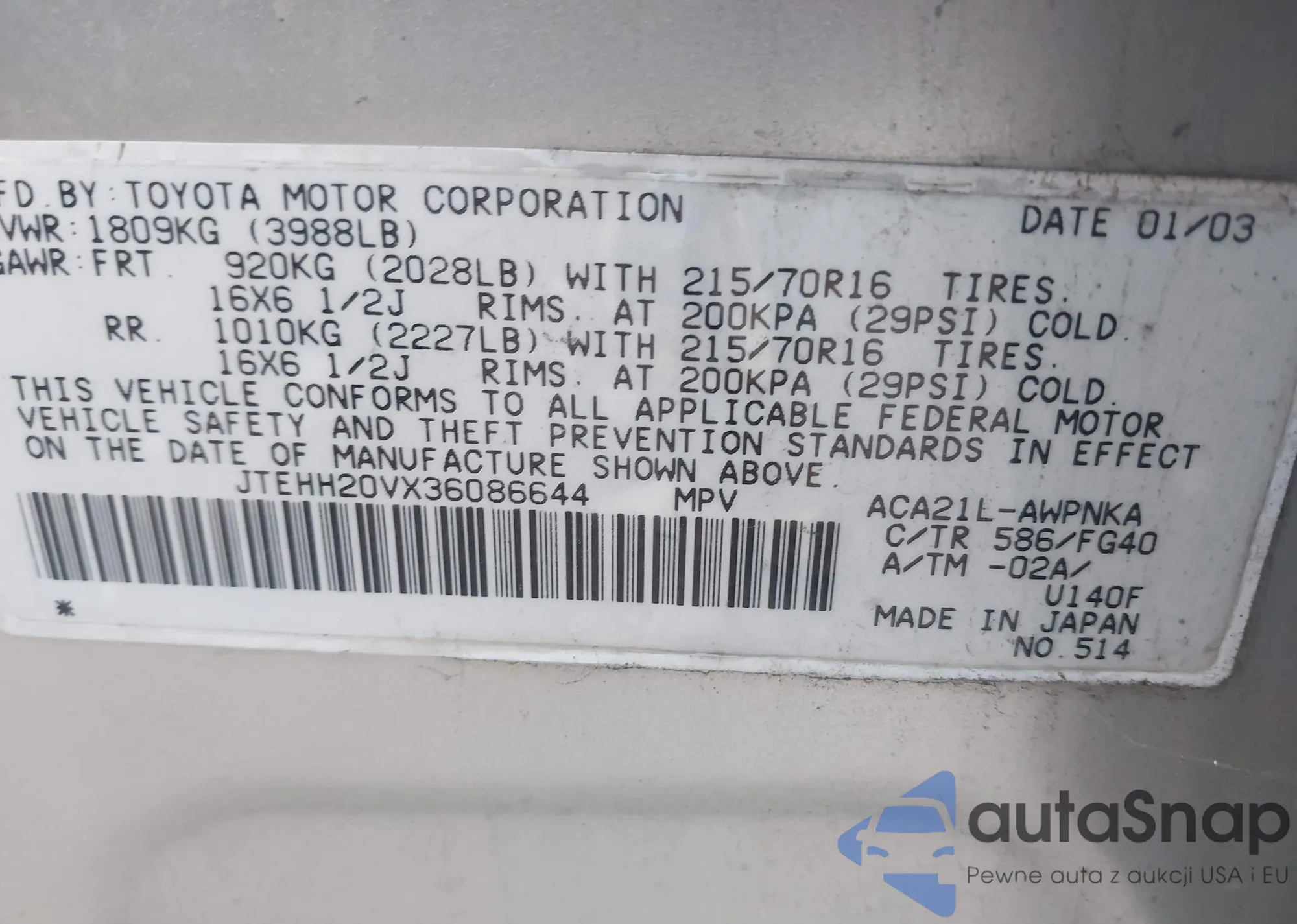 Автомобиль Toyota RAV 4 2003 (VIN JTEHH20VX36086644) имеет документы, препятствующие регистрации. Могут возникнуть сложности при экспорте и регистрации. Обратитесь к экспертам AutaSnap для поиска альтернатив.