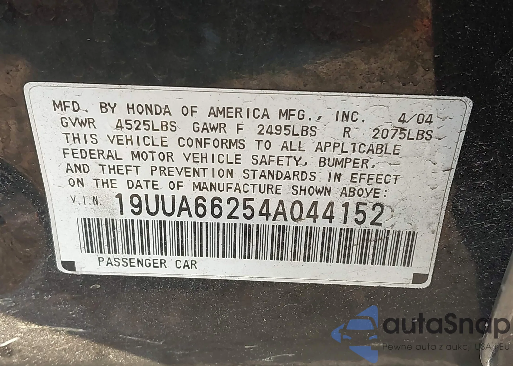 • VIN: 19UUA66254A044152