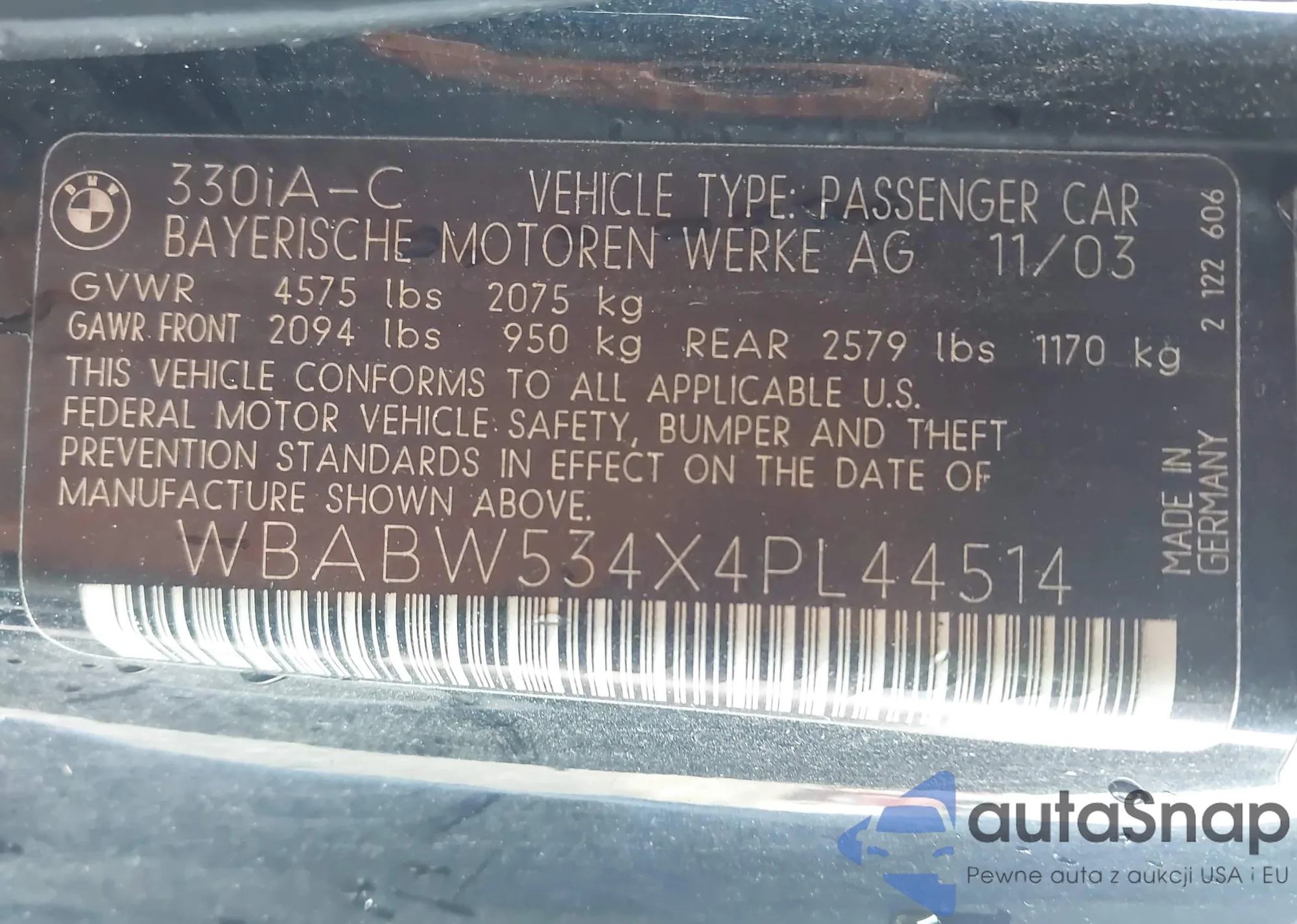 • VIN: WBABW534X4PL44514