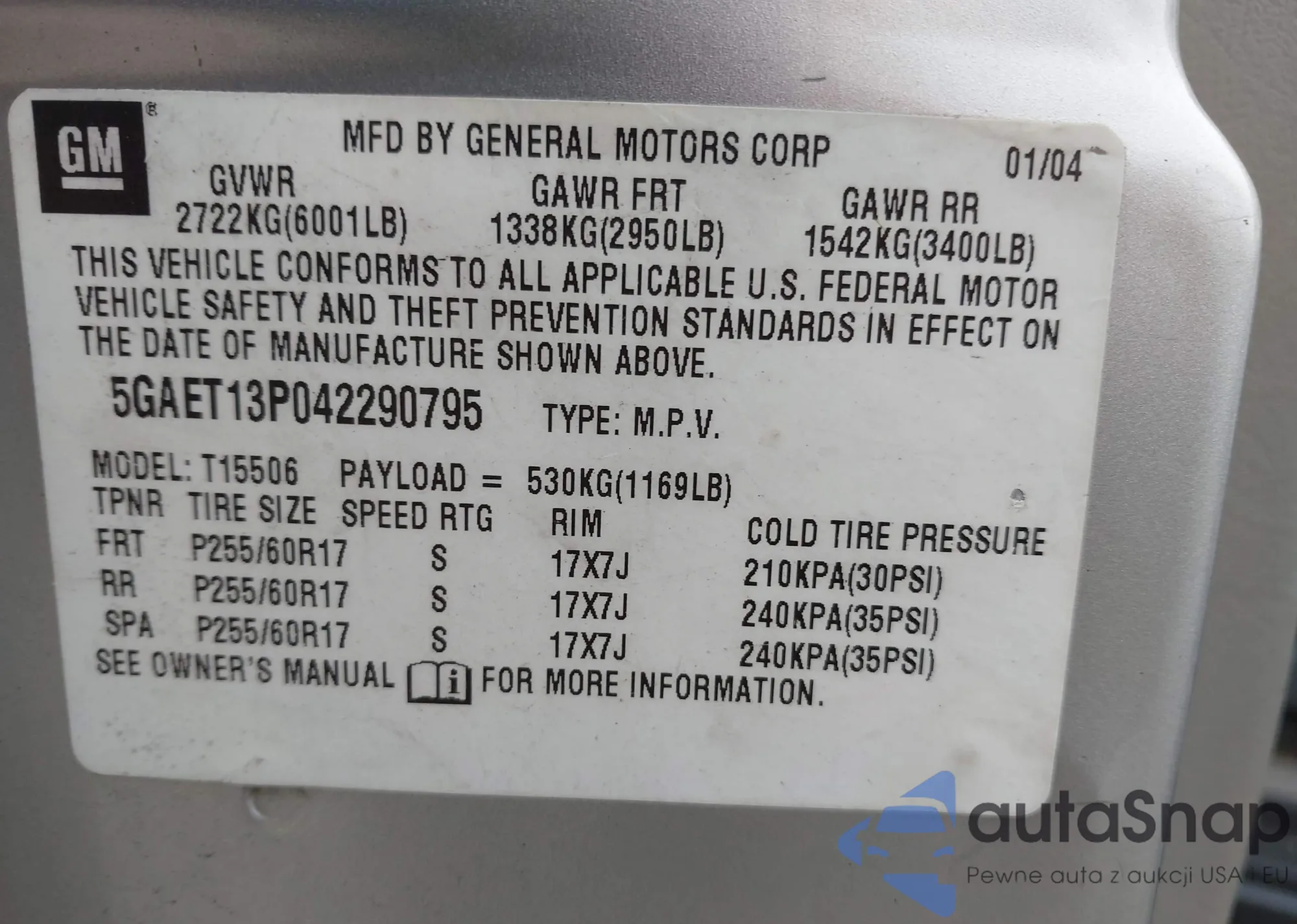 • VIN: 5GAET13P042290795