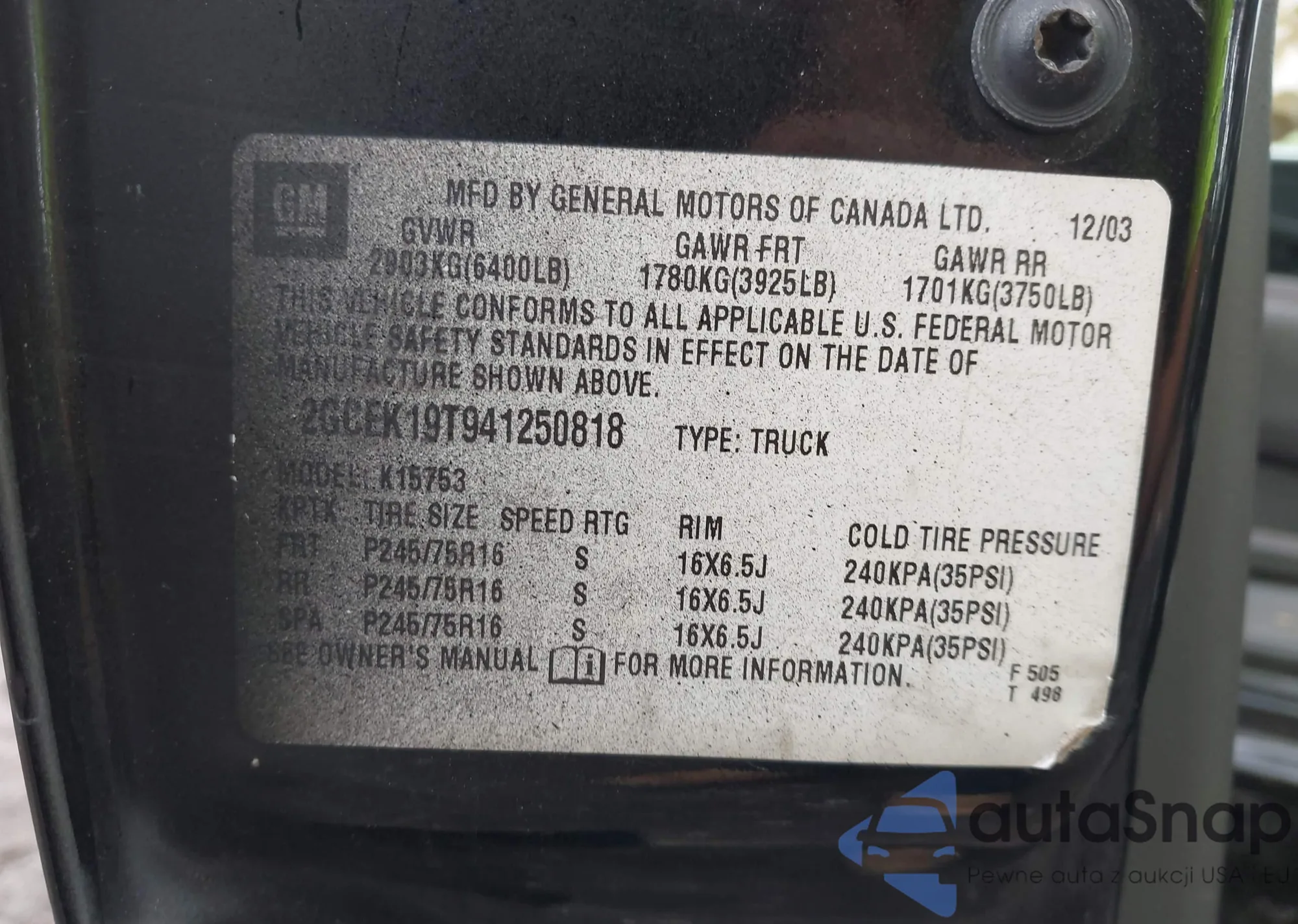 • VIN: 2GCEK19T941250818