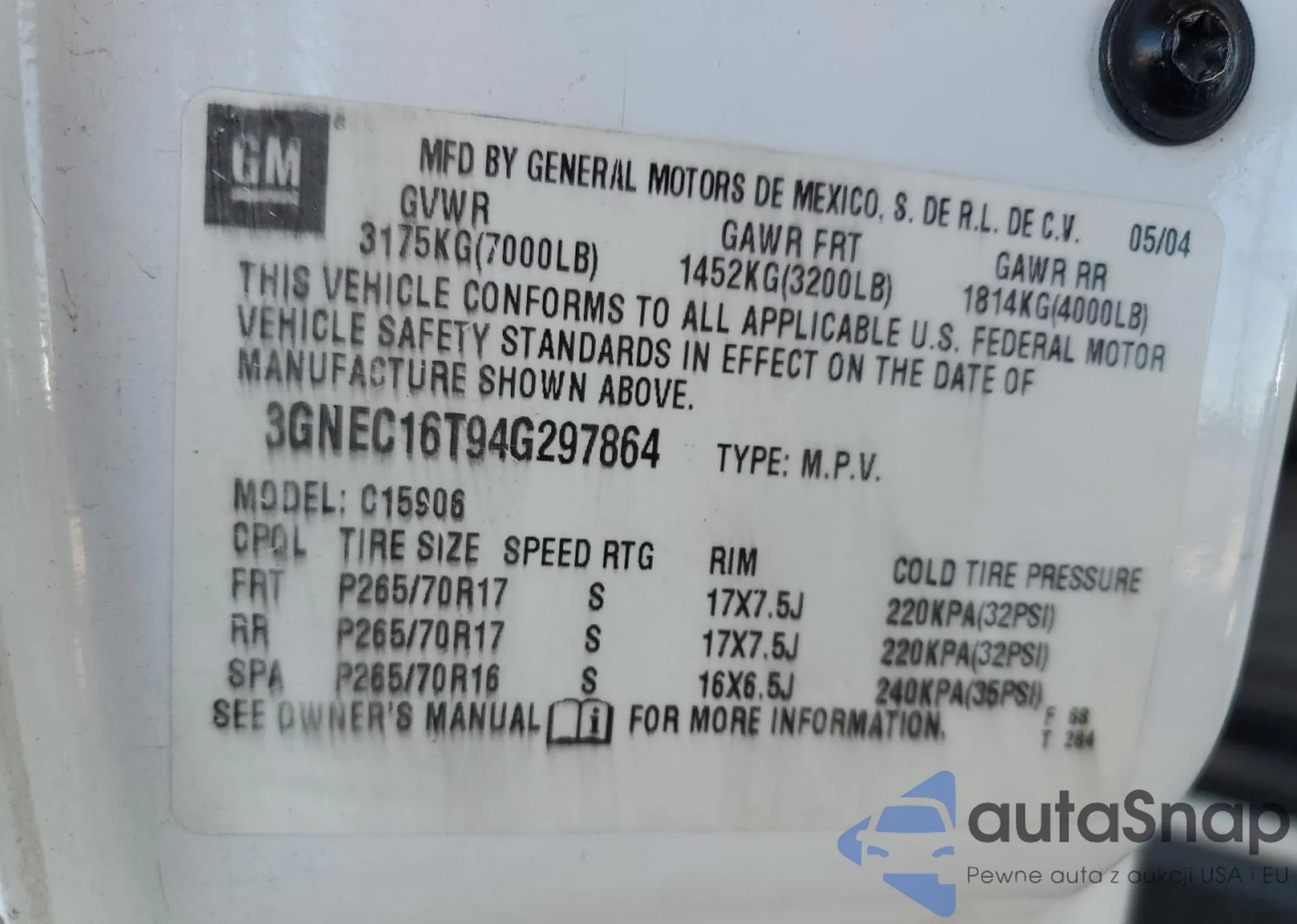 Автомобиль Chevrolet Suburban 2004 (VIN 3GNEC16T94G297864) имеет документы, препятствующие регистрации. Могут возникнуть сложности при экспорте и регистрации. Обратитесь к экспертам AutaSnap для поиска альтернатив.