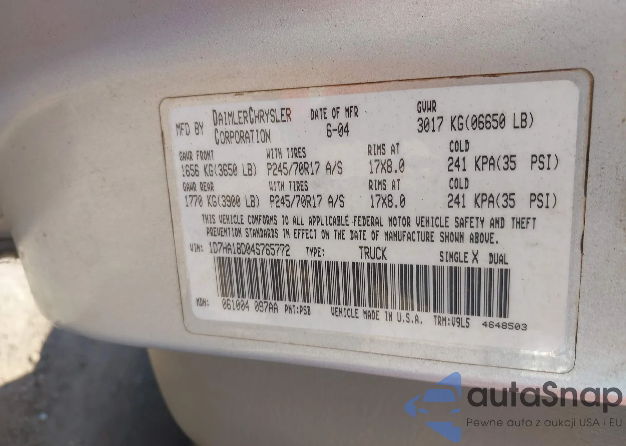 Автомобиль Dodge RAM 2004 (VIN 1D7HA18D04S765772) ранее не участвовал в торгах. Документы чистые, пробег соответствует или ниже среднего по рынку. Продаётся страховой компанией — рекомендуем покупку. Доставка в порт займет около 6–8 недель.