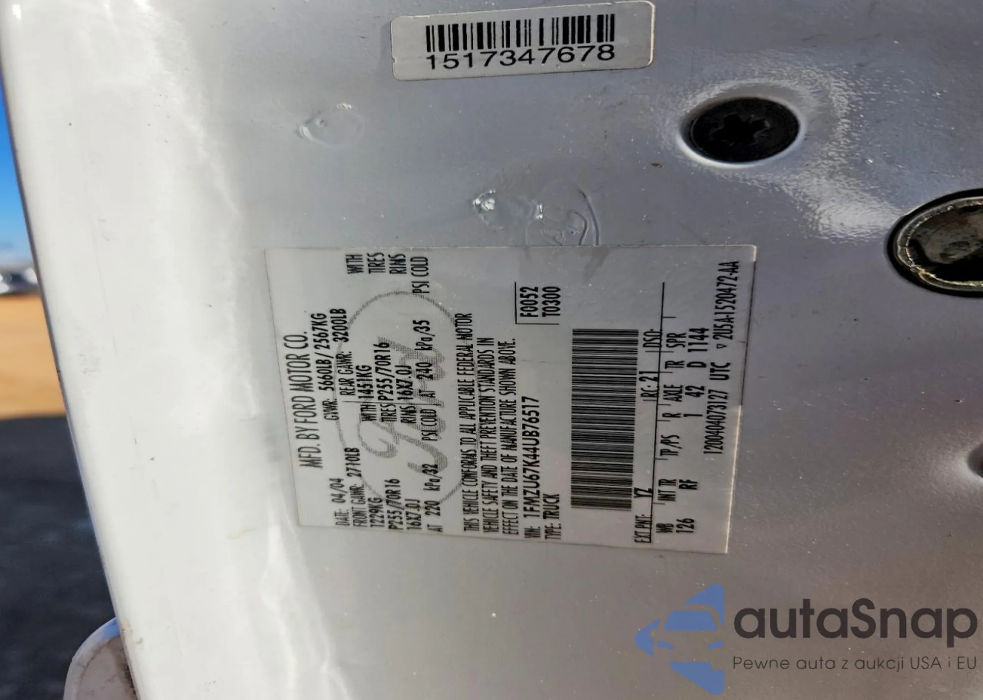 Автомобиль Ford Explorer Sport Trac 2004 (VIN 1FMZU67K44UB76517) ранее не участвовал в торгах. Документы чистые, пробег соответствует или ниже среднего по рынку. Продаётся страховой компанией — рекомендуем покупку. Доставка в порт займет около 6–8 недель.
