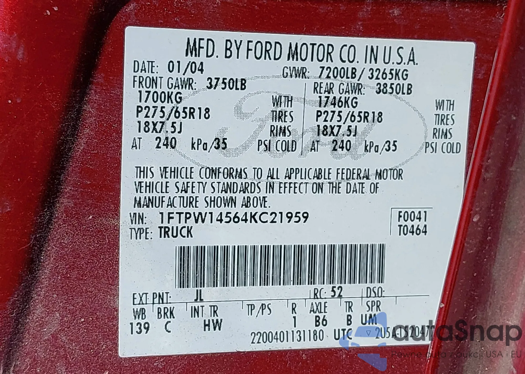 VIN: 1FTPW14564KC21959