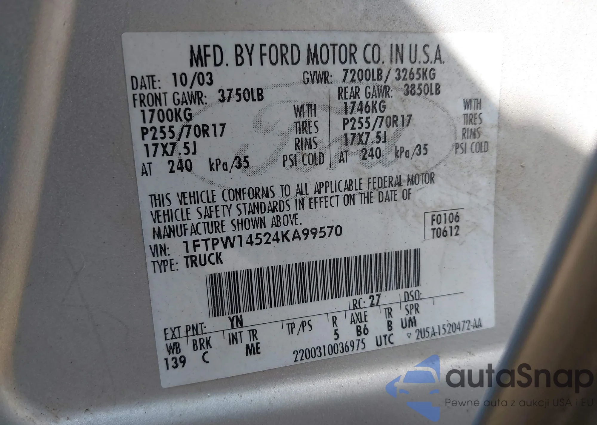 VIN: 1FTPW14524KA99570