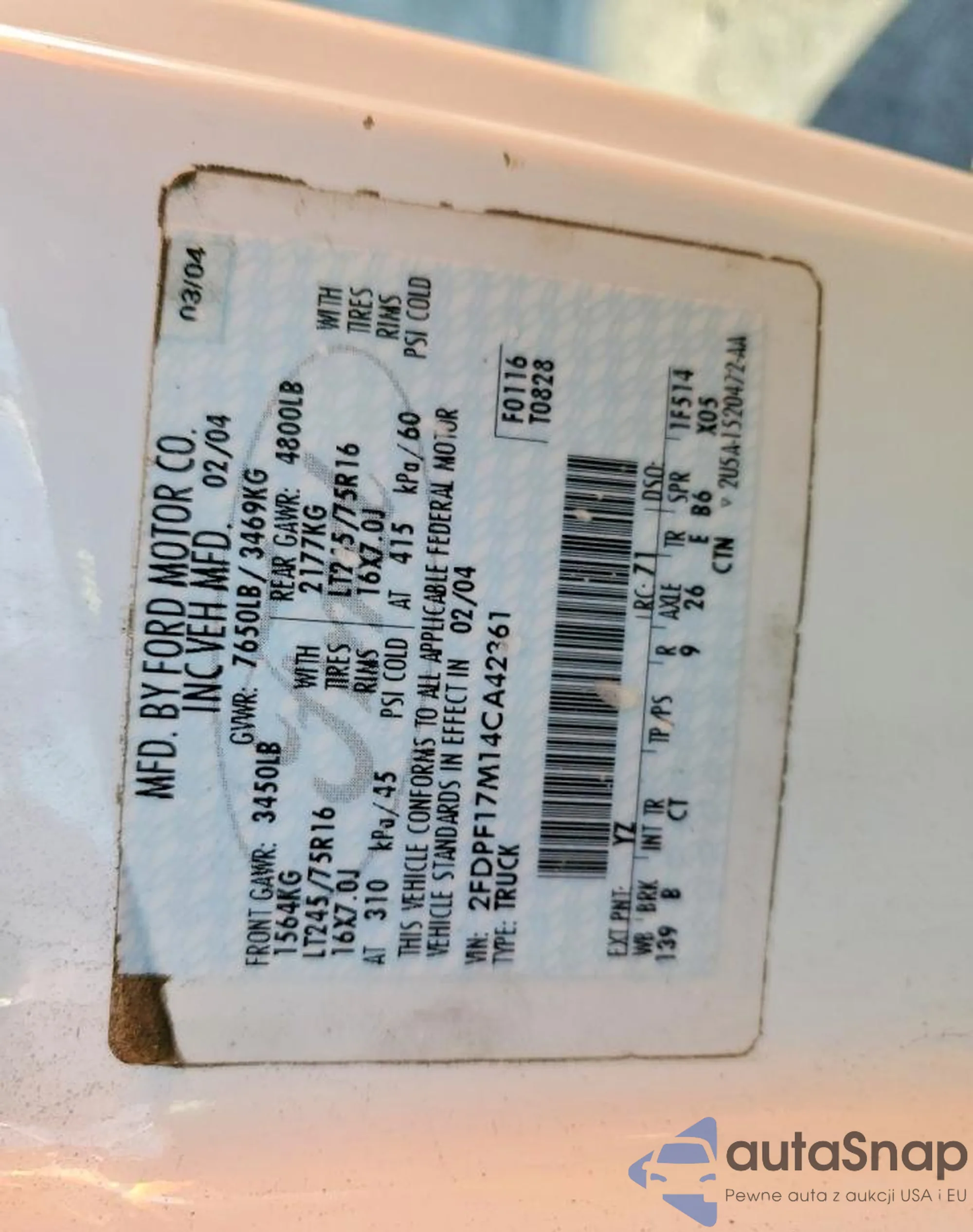 Автомобиль Ford F-150 2004 (VIN 2FDPF17M14CA42361) ранее не участвовал в торгах. Документы чистые, пробег соответствует или ниже среднего по рынку. Продаётся страховой компанией — рекомендуем покупку. Доставка в порт займет около 6–8 недель.