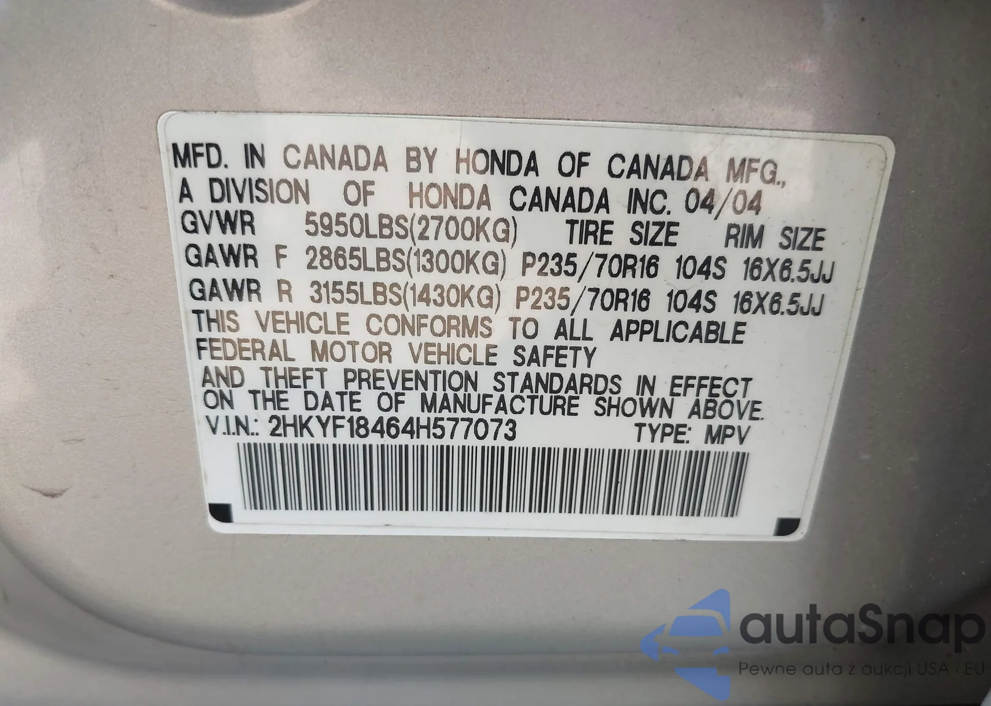 VIN: 2HKYF18464H577073