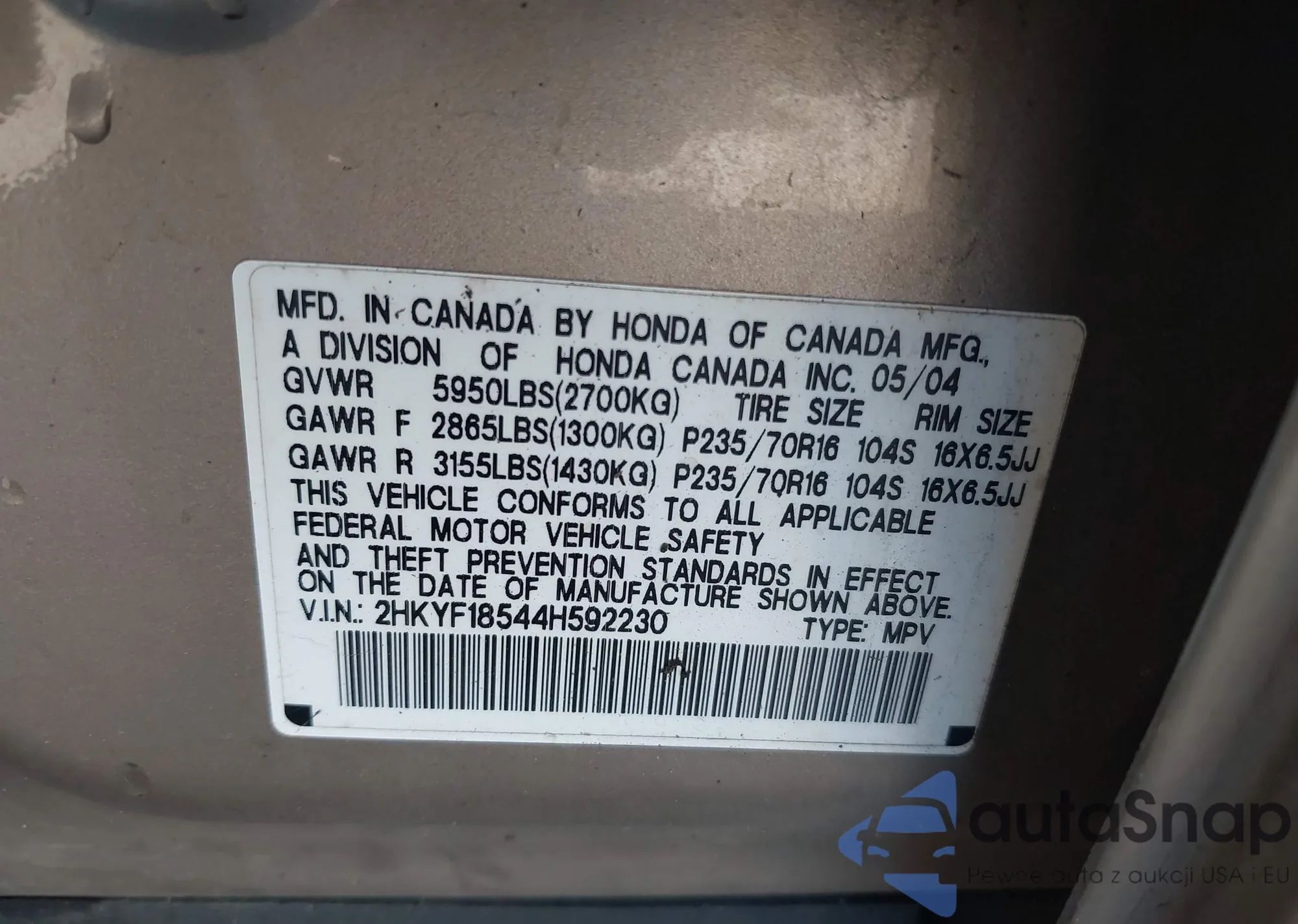 VIN: 2HKYF18544H592230